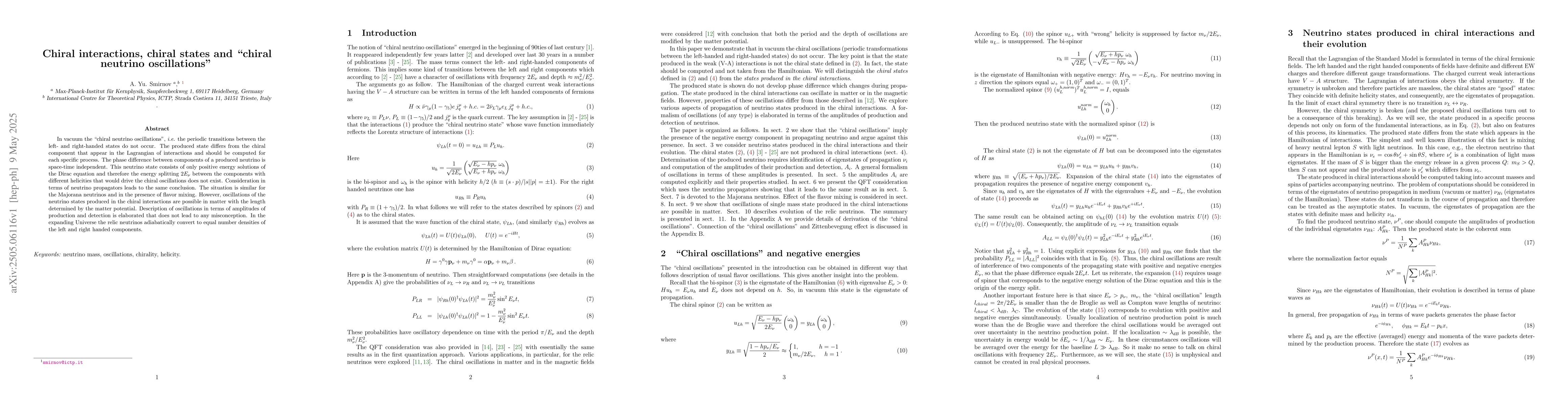 The paper discusses chiral interactions and neutrino oscillations, employing Dirac equation solutions and neutrino propagator considerations.