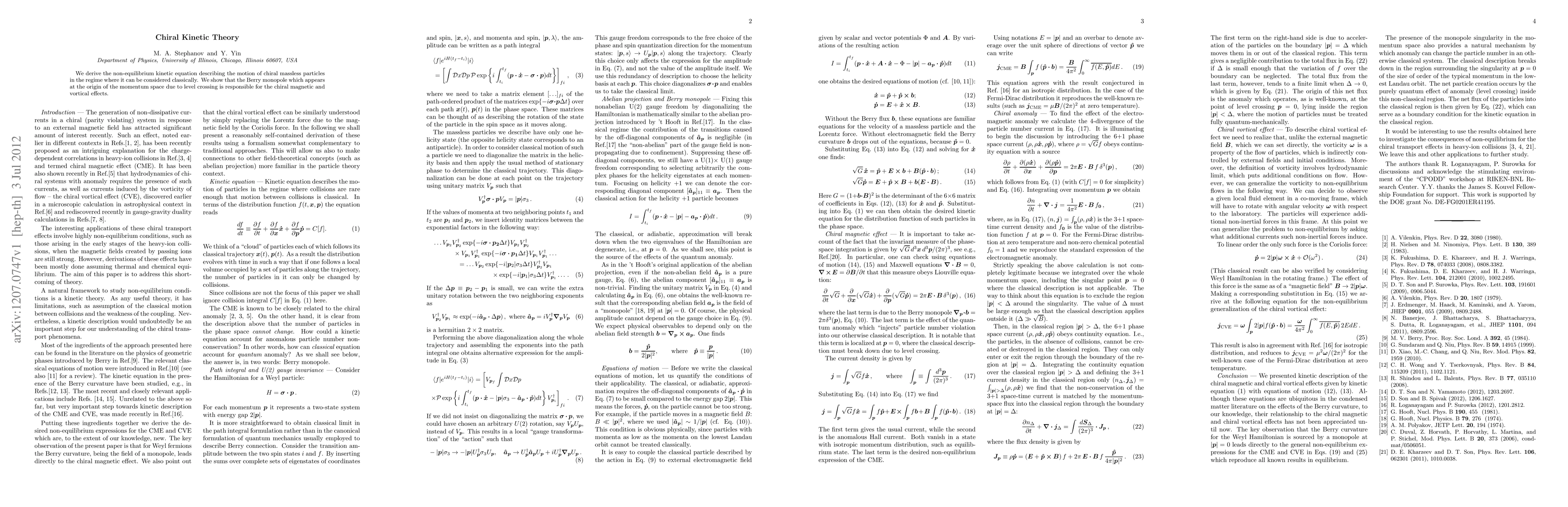 This paper derives a non-equilibrium kinetic equation for chiral massless particles, revealing that the Berry monopole at the origin of momentum space leads to chiral magnetic and vortical effects. The findings highlight the classical regime's connection to quantum mechanical phenomena.