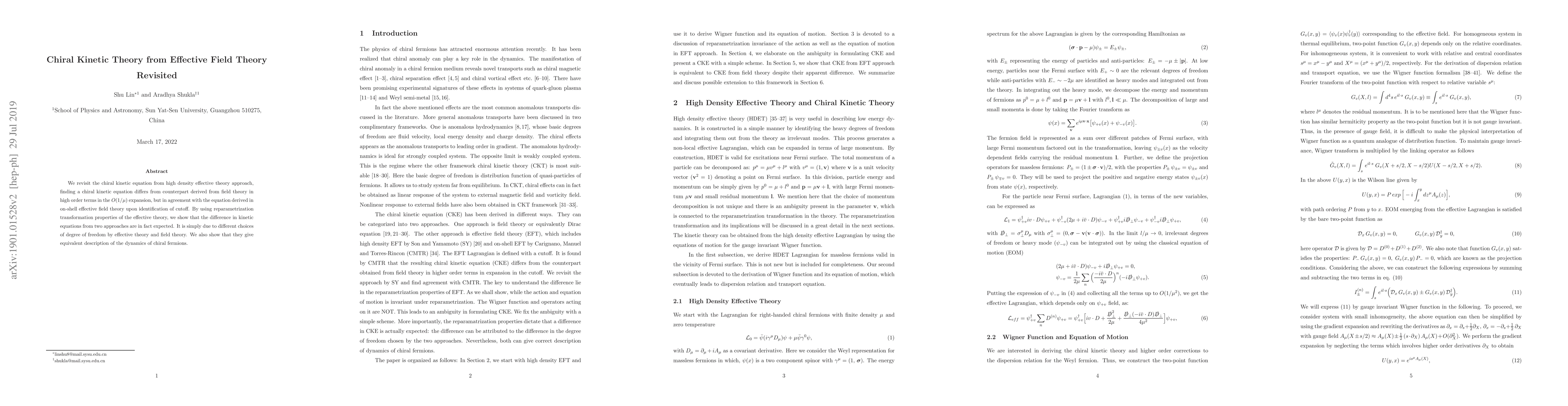 This paper revisits the chiral kinetic equation derived from high-density effective field theory, identifying discrepancies in high-order terms compared to field theory but aligning with on-shell effective field theory when cutoffs are properly identified. The study concludes that these differences arise from different degrees of freedom chosen by effective theory versus field theory, but both provide equivalent descriptions of chiral fermion dynamics.