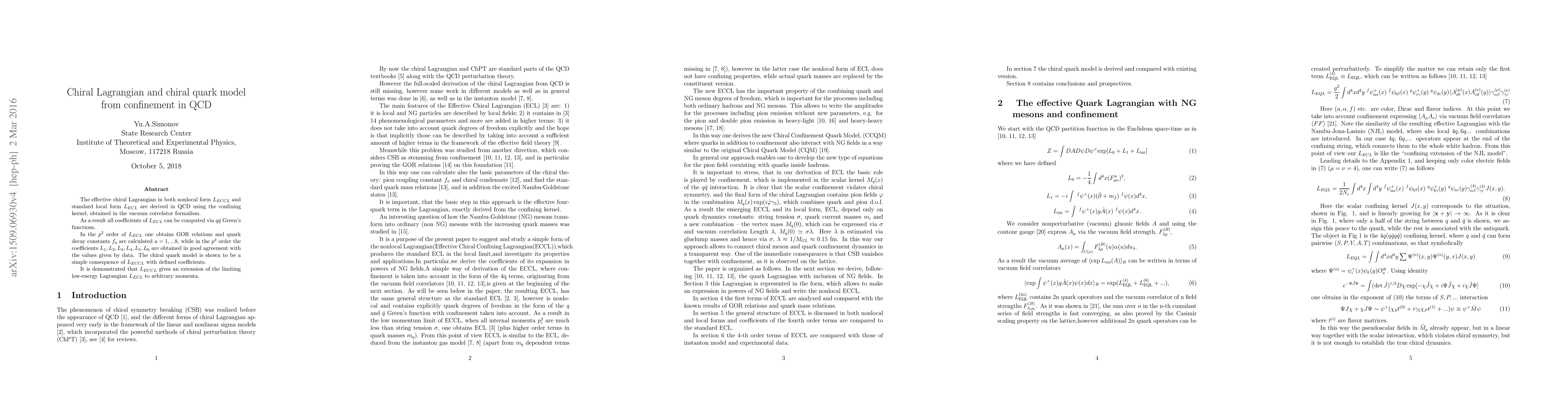 The effective chiral Lagrangian in both nonlocal form $L_{ECCL}$ and standard local form $L_{ECL}$ are derived in QCD using the confining kernel, obtained in the vacuum correlator formalism. As a result all coefficients of $L_{ECL}$ can be computed via $q\bar q$ Green's functions. In the $p^2$ order of $L_{ECL}$ one obtains GOR relations and quark decay constants $f_a$ are calculated $a=1,...8$, while in the $p^4$ order the coefficients $L_1, L_2, L_3,L_4, L_5, L_6$ are obtained in good agreement with the values given by data. The chiral quark model is shown to be a simple consequence of $L_{ECCL}$ with defined coefficients. It is demonstrated that $L_{ECCL}$ gives an extension of the limiting low-energy Lagrangian $L_{ECL}$ to arbitrary momenta.