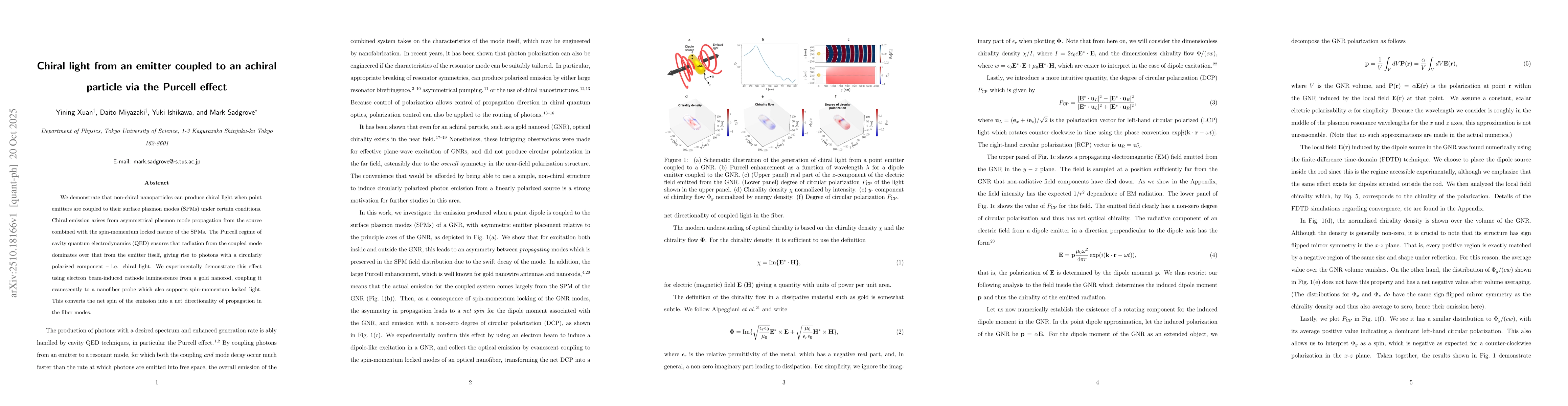 We demonstrate that non-chiral nanoparticles can produce chiral light when point emitters are coupled to their surface plasmon modes (SPMs) under certain conditions. Chiral emission arises from asymmetrical plasmon mode propagation from the source combined with the spin-momentum locked nature of the SPMs. The Purcell regime of cavity quantum electrodynamics (QED) ensures that radiation from the coupled mode dominates over that from the emitter itself, giving rise to photons with a circularly polarized component -- i.e. chiral light. We experimentally demonstrate this effect using electron beam-induced cathode luminescence from a gold nanorod, coupling it evanescently to a nanofiber probe which also supports spin-momentum locked light. This converts the net spin of the emission into a net directionality of propagation in the fiber modes.