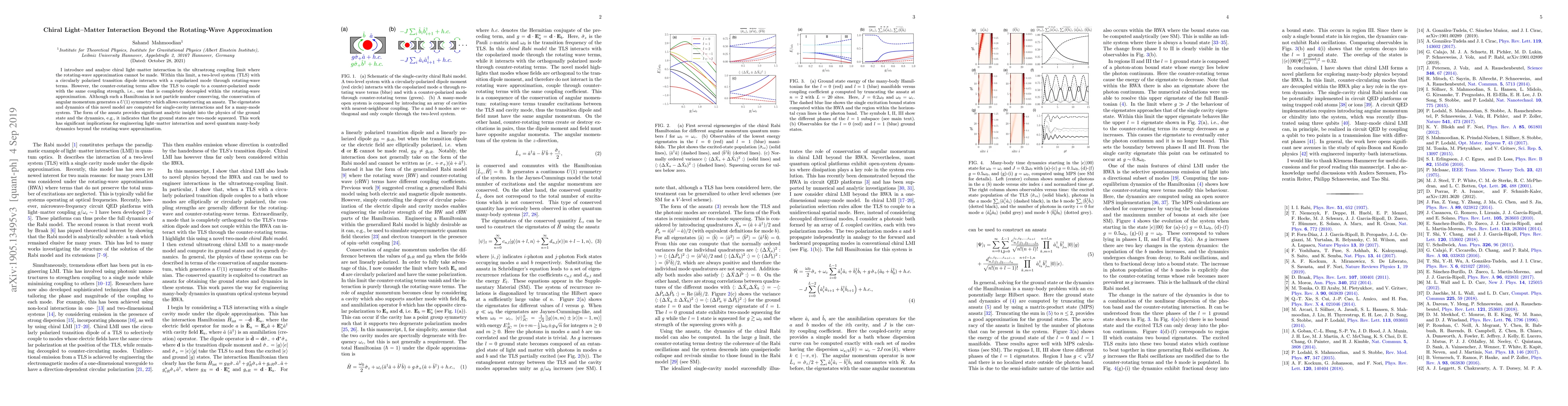 I introduce and analyse chiral light--matter interaction in the ultrastrong coupling limit where the rotating-wave approximation cannot be made. Within this limit, a two-level system (TLS) with a circularly polarized transition dipole interacts with a copolarized mode through rotating-wave terms. However, the counter-rotating terms allow the TLS to couple to a counter-polarized mode with the same coupling strength, i.e., one that is completely decoupled within the rotating-wave approximation. Although such a Hamiltonian is not particle number conserving, the conservation of angular momentum generates a $U(1)$ symmetry which allows constructing an ansatz. The eigenstates and dynamics of this novel model are computed for single-cavity interactions and for a many-mode system. The form of the ansatz provides significant analytic insight into the physics of the ground state and the dynamics, e.g., it indicates that the ground states are two-mode squeezed. This work has significant implications for engineering light--matter interaction and novel quantum many-body dynamics beyond the rotating-wave approximation.