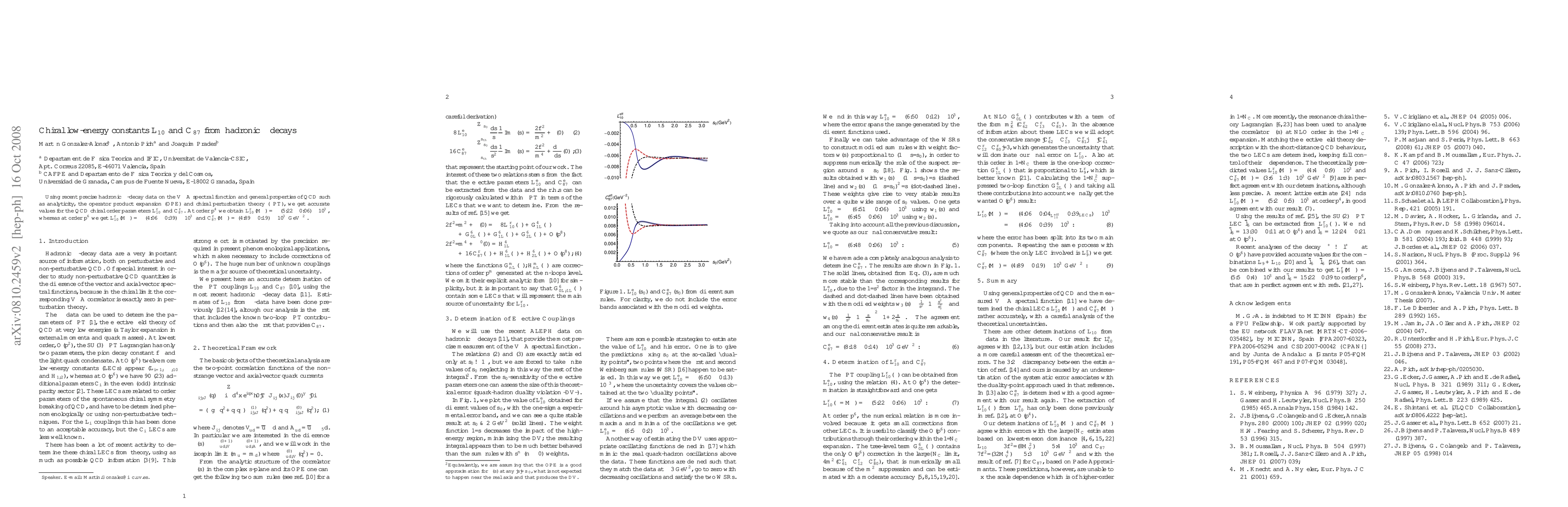 Using recent precise hadronic tau-decay data on the V-A spectral function and general properties of QCD such as analyticity, the operator product expansion and chiral perturbation theory, we get accurate values for the QCD chiral order parameters L_10 and C_87. At order p^4 we obtain L_10^r(M_rho)=-(5.22+-0.06)10^-3, whereas at order p^6 we get L_10^r(M_rho)=-(4.06+-0.39)10^-3 and C_87^r(M_rho) = (4.89+-0.19)10^-3 GeV^-2.