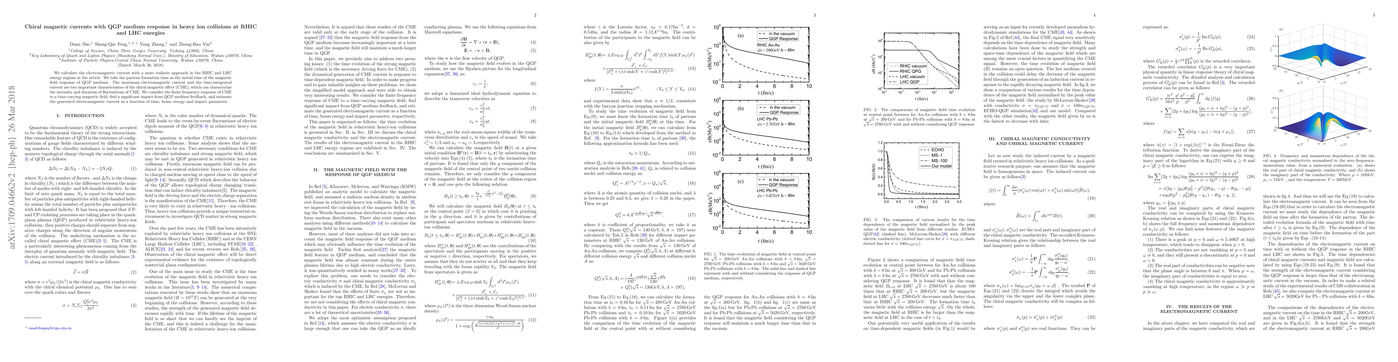 This paper investigates the electromagnetic current in heavy-ion collisions at RHIC and LHC energies, focusing on the chiral magnetic effect (CME) within a quark-gluon plasma (QGP) medium. The study finds significant QGP medium feedback and estimates the generated electromagnetic current based on time, beam energy, and impact parameter.