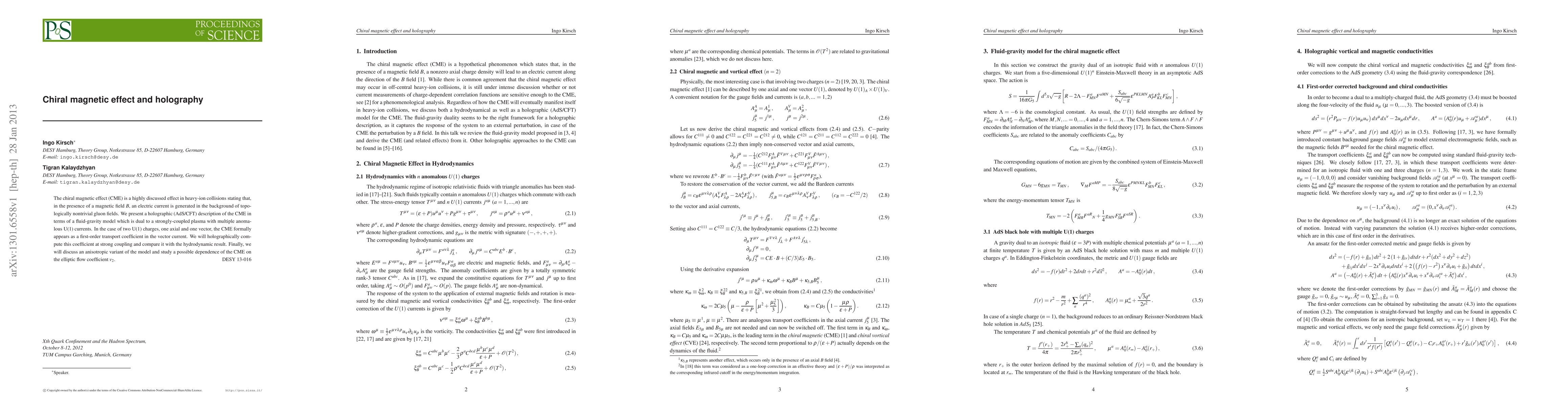 This paper presents a holographic (AdS/CFT) description of the chiral magnetic effect (CME), a phenomenon in heavy-ion collisions where a magnetic field generates an electric current. The study models a fluid-gravity system with multiple anomalous U(1) currents, computing a first-order transport coefficient at strong coupling. It also explores an anisotropic model's implications for CME dependence on elliptic flow coefficient v_2.