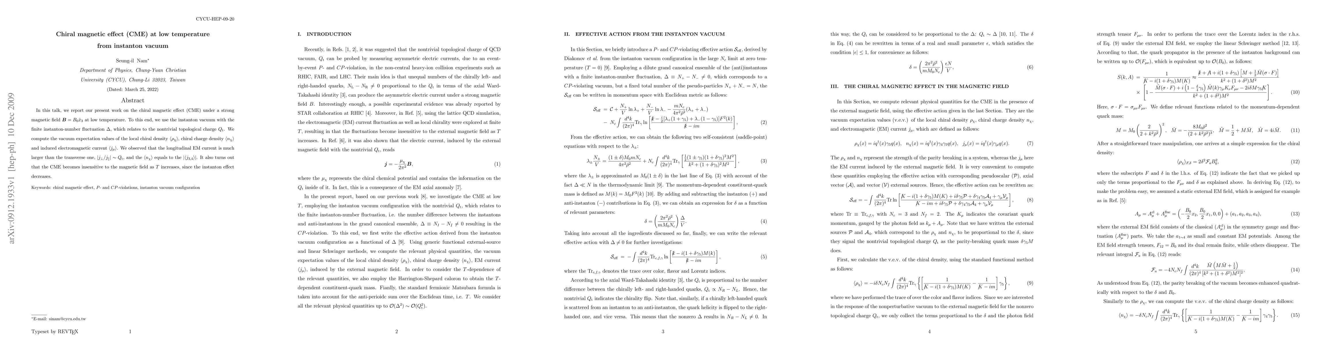 This research investigates the chiral magnetic effect (CME) under strong magnetic fields at low temperatures using the instanton vacuum model. It finds that the longitudinal electromagnetic current is significantly larger than the transverse one, and the CME diminishes with increasing temperature due to the decreasing instanton effect.