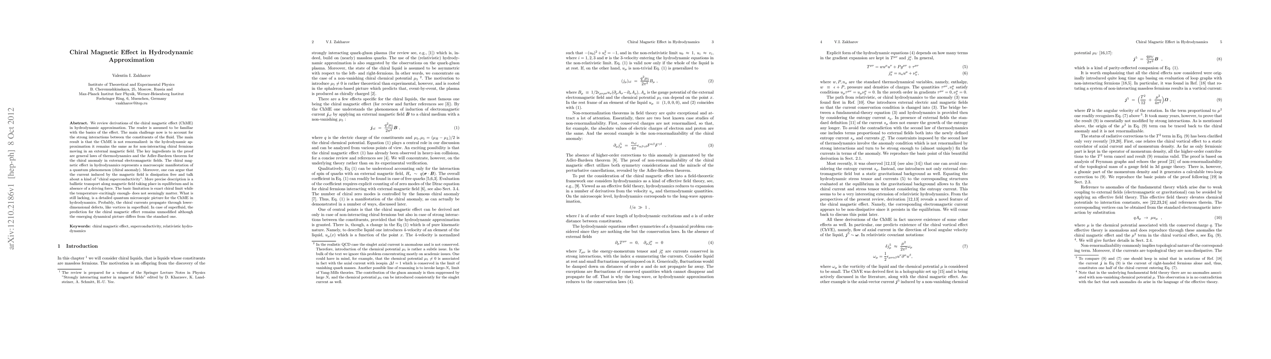 We review derivations of the chiral magnetic effect (ChME) in hydrodynamic approximation. The reader is assumed to be familiar with the basics of the effect. The main challenge now is to account for the strong interactions between the constituents of the fluid. The main result is that the ChME is not renormalized: in the hydrodynamic approximation it remains the same as for non-interacting chiral fermions moving in an external magnetic field. The key ingredients in the proof are general laws of thermodynamics and the Adler-Bardeen theorem for the chiral anomaly in external electromagnetic fields. The chiral magnetic effect in hydrodynamics represents a macroscopic manifestation of a quantum phenomenon (chiral anomaly). Moreover, one can argue that the current induced by the magnetic field is dissipation free and talk about a kind of "chiral superconductivity". More precise description is a ballistic transport along magnetic field taking place in equilibrium and in absence of a driving force. The basic limitation is exact chiral limit while the temperature--excitingly enough- does not seemingly matter. What is still lacking, is a detailed quantum microscopic picture for the ChME in hydrodynamics. Probably, the chiral currents propagate through lower-dimensional defects, like vortices in superfluid. In case of superfluid, the prediction for the chiral magnetic effect remains unmodified although the emerging dynamical picture differs from the standard one.
