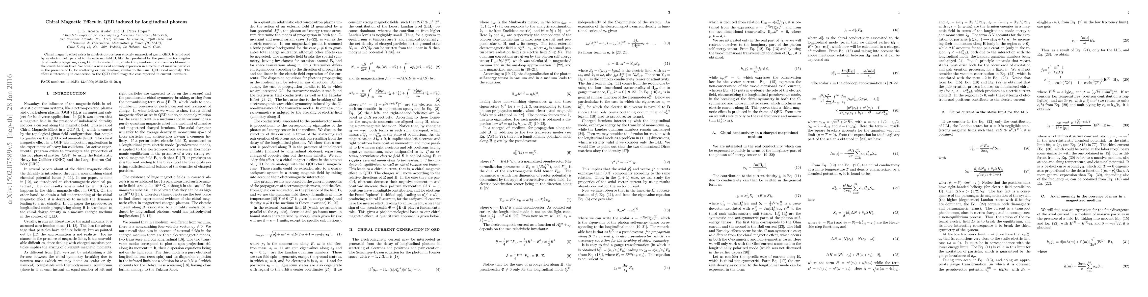 The research identifies a Chiral Magnetic Effect in Quantum Electrodynamics (QED) caused by longitudinal photons in a magnetized electron-positron gas. A novel axial anomaly expression in a medium of massive particles under magnetic field is derived, paralleling the standard QED anomaly. The findings are significant for understanding QCD chiral magnetic effects.