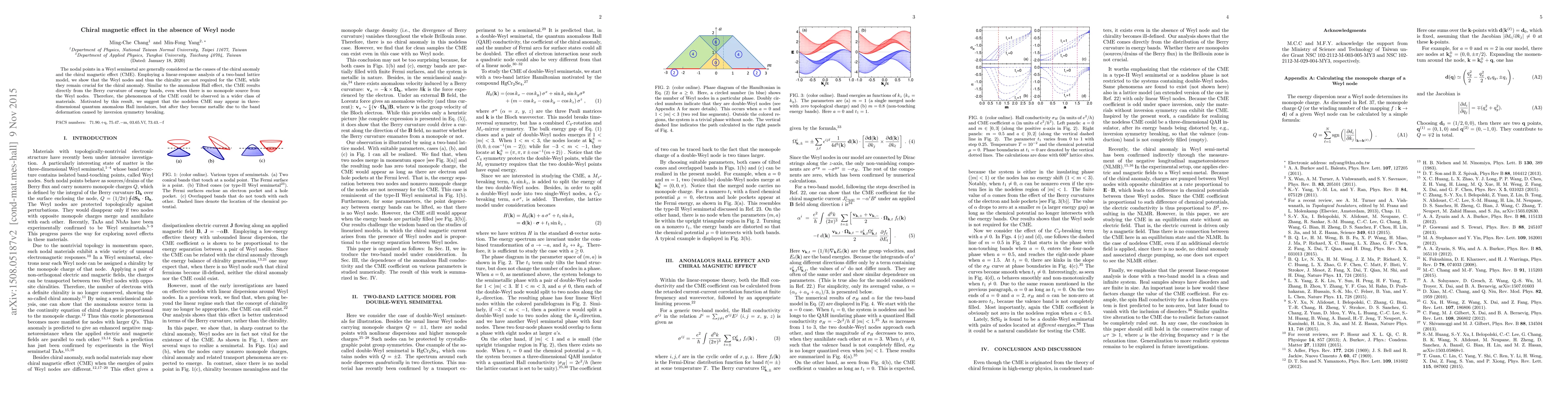 The nodal points in a Weyl semimetal are generally considered as the causes of the chiral anomaly and the chiral magnetic effect (CME). Employing a linear-response analysis of a two-band lattice model, we show that the Weyl nodes and thus the chirality are not required for the CME, while they remain crucial for the chiral anomaly. Similar to the anomalous Hall effect, the CME results directly from the Berry curvature of energy bands, even when there is no monopole source from the Weyl nodes. Therefore, the phenomenon of the CME could be observed in a wider class of materials. Motivated by this result, we suggest that the nodeless CME may appear in three-dimensional quantum anomalous Hall insulators, but after they become metallic due to the band deformation caused by inversion symmetry breaking.
