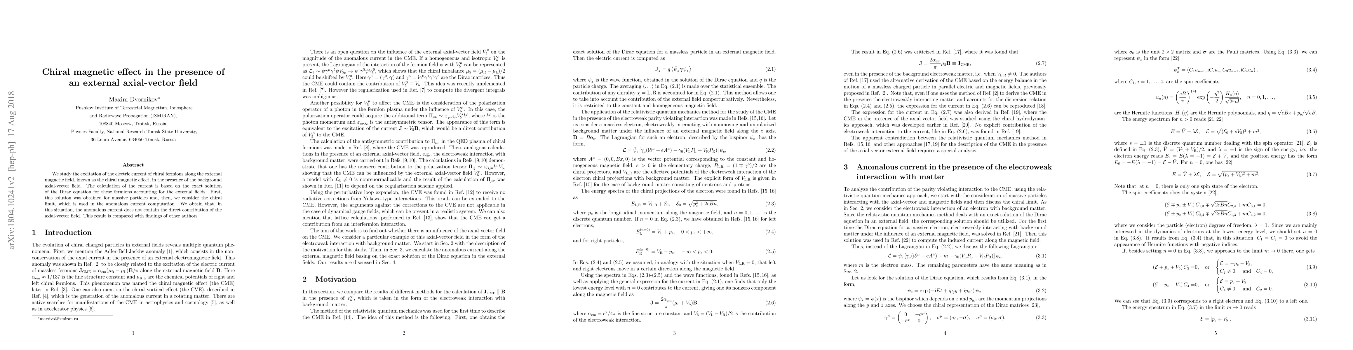 This paper investigates the chiral magnetic effect in chiral fermions under an external axial-vector field, deriving the exact solution of the Dirac equation for both massive and massless particles. It finds that the anomalous current does not directly depend on the axial-vector field, contrasting with some previous studies.