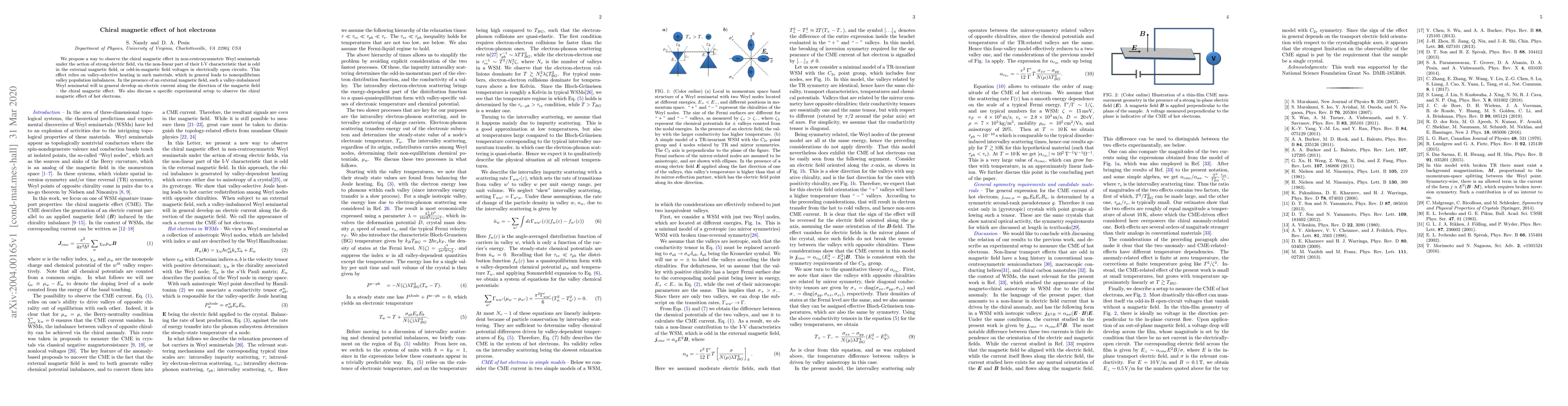 We propose a way to observe the chiral magnetic effect in non-centrosymmetric Weyl semimetals under the action of strong electric field, via the non-linear part of their I-V characteristic that is odd in the external magnetic field, or odd-in-magnetic field voltages in electrically open circuits. This effect relies on valley-selective heating in such materials, which in general leads to nonequilibrium valley population imbalances. In the presence of an external magnetic field, such a valley-imbalanced Weyl semimetal will in general develop an electric current along the direction of the magnetic field -- the chiral magnetic effect. We also discuss a specific experimental setup to observe the chiral magnetic effect of hot electrons.
