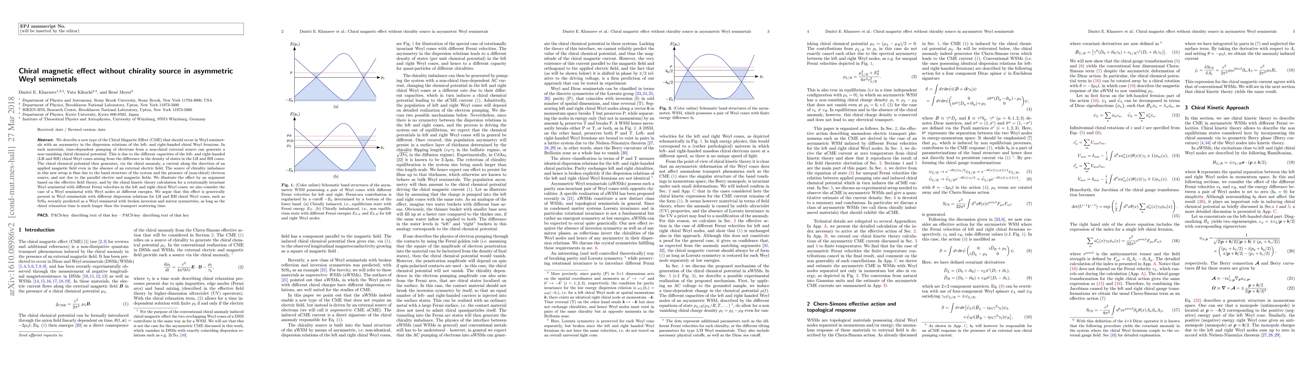 We describe a new type of the Chiral Magnetic Effect (CME) that should occur in Weyl semimetals with an asymmetry in the dispersion relations of the left- and right-handed chiral Weyl fermions. In such materials, time-dependent pumping of electrons from a non-chiral external source generates a non-vanishing chiral chemical potential. This is due to the different capacities of the left- and right-handed (LH and RH) chiral Weyl cones arising from the difference in the density of states in the LH and RH cones. The chiral chemical potential then generates, via the chiral anomaly, a current along the direction of an applied magnetic field even in the absence of an external electric field. The source of chirality imbalance in this new setup is thus due to the band structure of the system and the presence of (non-chiral) electron source, and not due to the parallel electric and magnetic fields. We illustrate the effect by an argument based on the effective field theory, and by the chiral kinetic theory calculation for a rotationally invariant Weyl semimetal with different Fermi velocities in the left and right chiral Weyl cones; we also consider the case of a Weyl semimetal with Weyl nodes at different energies. We argue that this effect is generically present in Weyl semimetals with different dispersion relations for LH and RH chiral Weyl cones, such as SrSi2 recently predicted as a Weyl semimetal with broken inversion and mirror symmetries, as long as the chiral relaxation time is much longer than the transport scattering time.