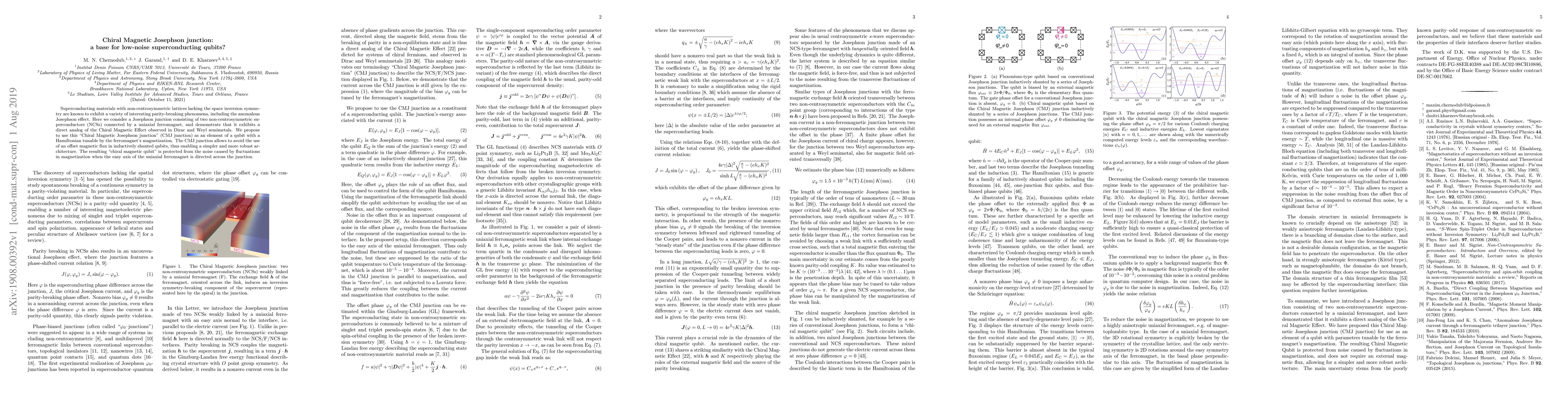 This paper explores a "Chiral Magnetic Josephson junction" (CMJ junction) between non-centrosymmetric superconductors connected by a uniaxial ferromagnet, proposing it as a low-noise superconducting qubit element. The CMJ junction offers a tunable Hamiltonian and noise protection, simplifying qubit architecture.