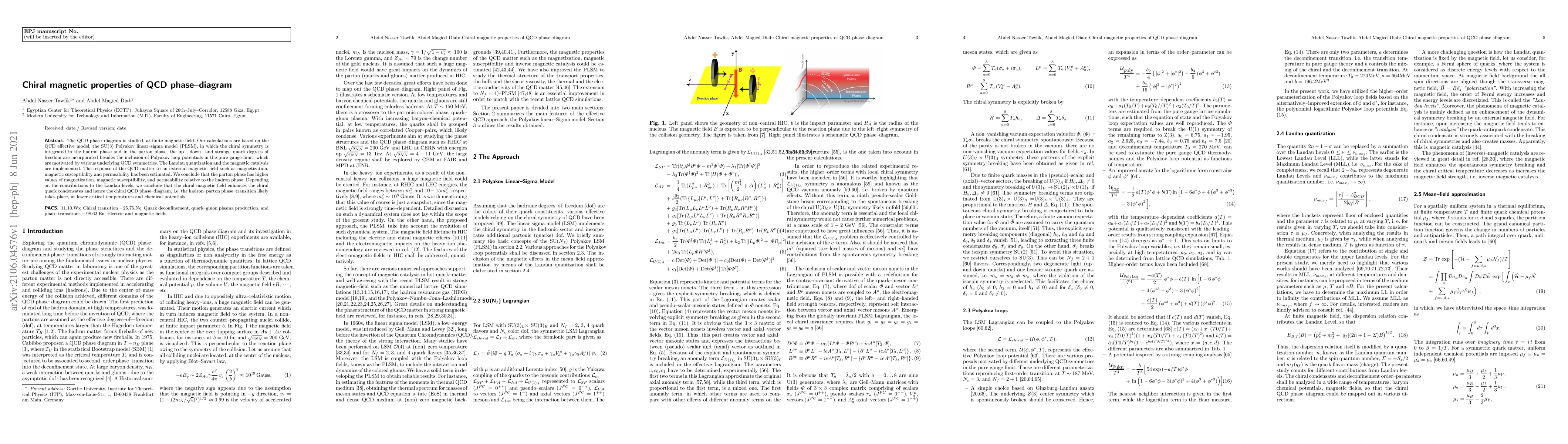 The QCD phase diagram is studied, at finite magnetic field. Our calculations are based on the QCD effective model, the SU($3$) Polyakov linear sigma model (PLSM), in which the chiral symmetry is integrated in the hadron phase and in the parton phase, the up-, down- and strange-quark degrees of freedom are incorporated besides the inclusion of Polyakov loop potentials in the pure gauge limit, which are motivated by various underlying QCD symmetries. The Landau quantization and the magnetic catalysis are implemented. The response of the QCD matter to an external magnetic field such as magnetization, magnetic susceptibility and permeability has been estimated. We conclude that the parton phase has higher values of magnetization, magnetic susceptibility, and permeability relative to the hadron phase. Depending on the contributions to the Landau levels, we conclude that the chiral magnetic field enhances the chiral quark condensates and hence the chiral QCD phase diagram, i.e. the hadron-parton phase transition likely takes place, at lower critical temperatures and chemical potentials.