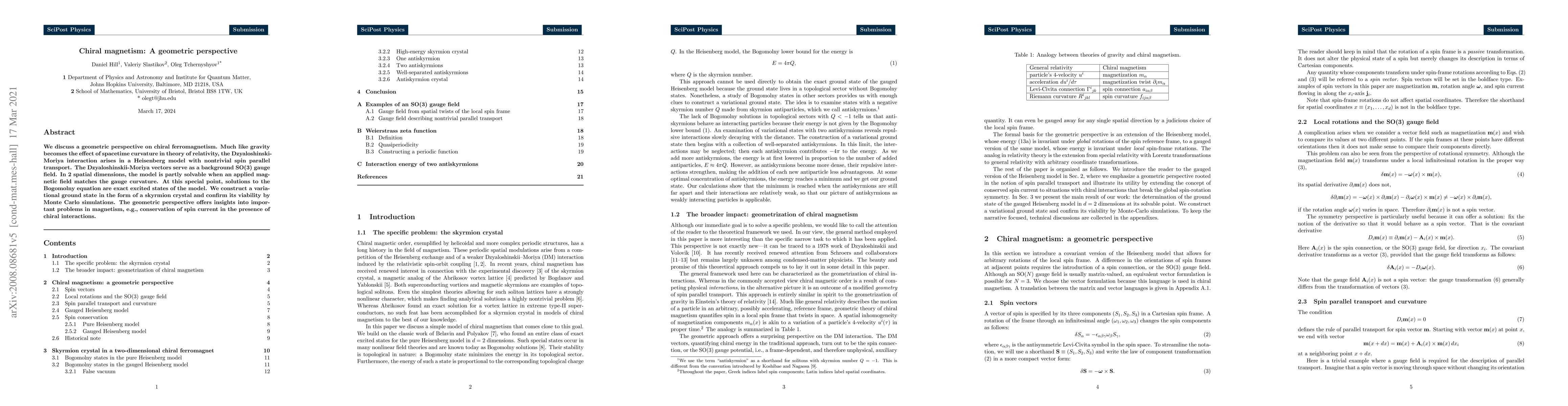 We discuss a geometric perspective on chiral ferromagnetism. Much like gravity becomes the effect of spacetime curvature in theory of relativity, the Dzyaloshinski-Moriya interaction arises in a Heisenberg model with nontrivial spin parallel transport. The Dzyaloshinskii-Moriya vectors serve as a background SO(3) gauge field. In 2 spatial dimensions, the model is partly solvable when an applied magnetic field matches the gauge curvature. At this special point, solutions to the Bogomolny equation are exact excited states of the model. We construct a variational ground state in the form of a skyrmion crystal and confirm its viability by Monte Carlo simulations. The geometric perspective offers insights into important problems in magnetism, e.g., conservation of spin current in the presence of chiral interactions.