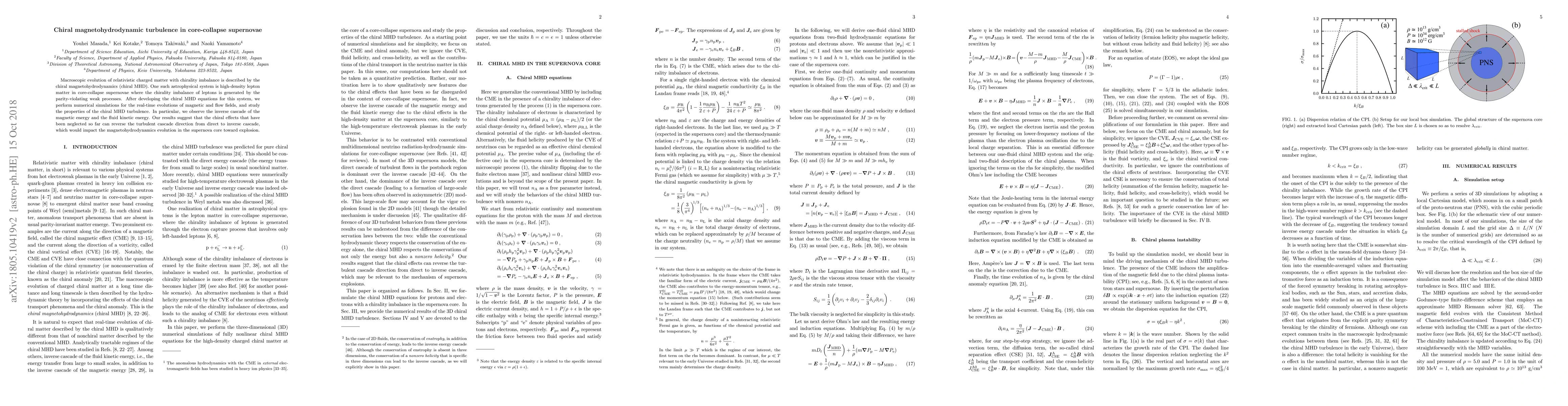 This paper develops chiral magnetohydrodynamics (chiral MHD) equations to describe the evolution of relativistic charged matter in core-collapse supernovae, revealing that chirality imbalance can reverse the turbulent cascade direction from direct to inverse, potentially impacting the supernova explosion dynamics. Numerical simulations show an inverse cascade of magnetic and kinetic energy due to chiral effects.