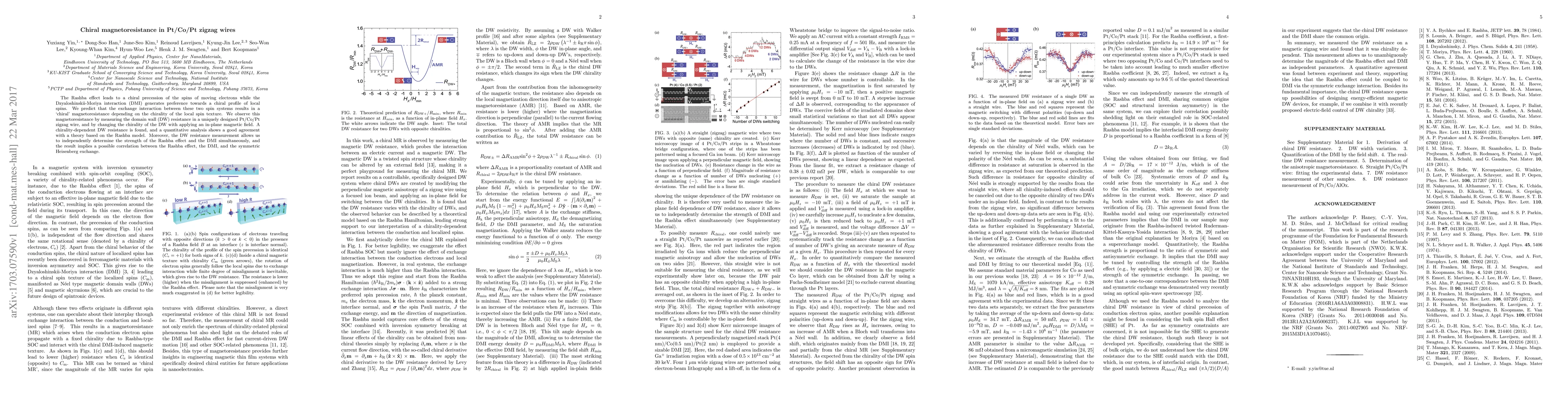 The Rashba effect leads to a chiral precession of the spins of moving electrons while the Dzyaloshinskii-Moriya interaction (DMI) generates preference towards a chiral profile of local spins. We predict that the exchange interaction between these two spin systems results in a 'chiral' magnetoresistance depending on the chirality of the local spin texture. We observe this magnetoresistance by measuring the domain wall (DW) resistance in a uniquely designed Pt/Co/Pt zigzag wire, and by changing the chirality of the DW with applying an in-plane magnetic field. A chirality-dependent DW resistance is found, and a quantitative analysis shows a good agreement with a theory based on the Rashba model. Moreover, the DW resistance measurement allows us to independently determine the strength of the Rashba effect and the DMI simultaneously, and the result implies a possible correlation between the Rashba effect, the DMI, and the symmetric Heisenberg exchange.