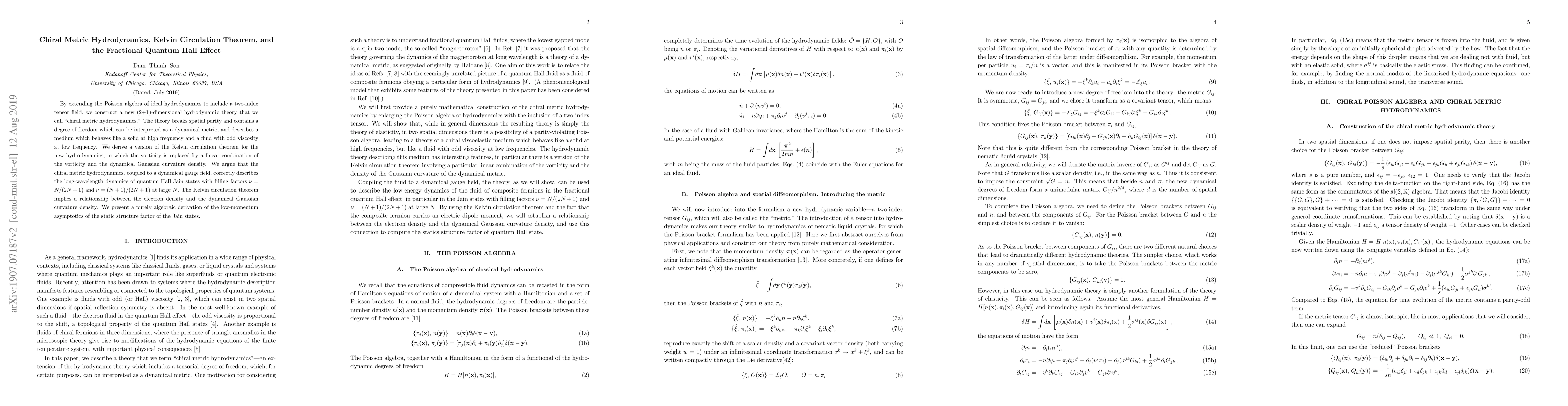 By extending the Poisson algebra of ideal hydrodynamics to include a two-index tensor field, we construct a new (2+1)-dimensional hydrodynamic theory that we call "chiral metric hydrodynamics." The theory breaks spatial parity and contains a degree of freedom which can be interpreted as a dynamical metric, and describes a medium which behaves like a solid at high frequency and a fluid with odd viscosity at low frequency. We derive a version of the Kelvin circulation theorem for the new hydrodynamics, in which the vorticity is replaced by a linear combination of the vorticity and the dynamical Gaussian curvature density. We argue that the chiral metric hydrodynamics, coupled to a dynamical gauge field, correctly describes the long-wavelength dynamics of quantum Hall Jain states with filling factors $\nu=N/(2N+1)$ and $\nu=(N+1)/(2N+1)$ at large $N$. The Kelvin circulation theorem implies a relationship between the electron density and the dynamical Gaussian curvature density. We present an purely algebraic derivation of the low-momentum asymptotics of the static structure factor of the Jain states.