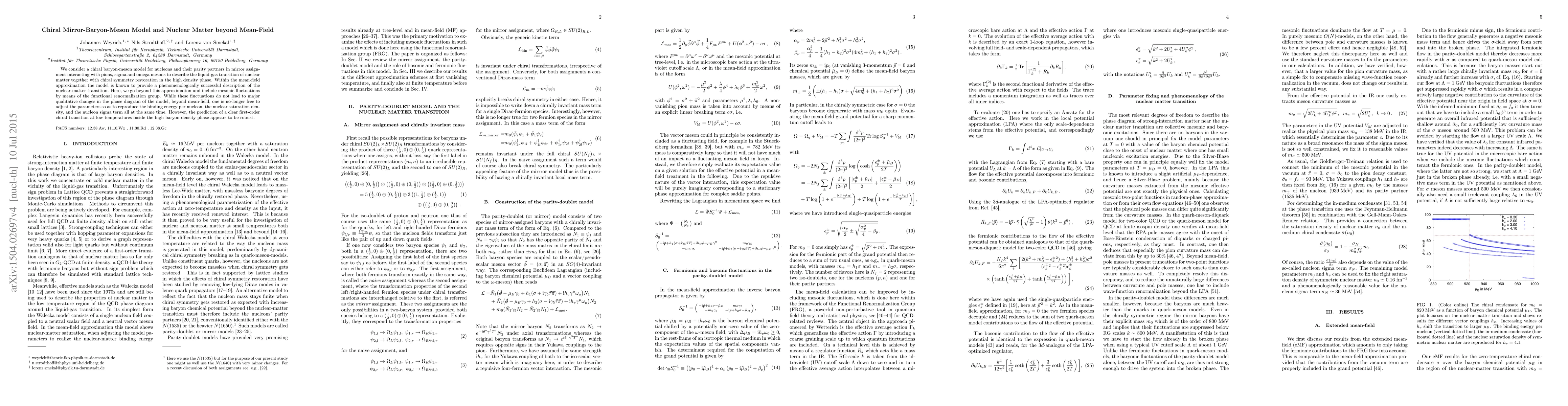 We consider a chiral baryon-meson model for nucleons and their parity partners in mirror assignment interacting with pions, sigma and omega mesons to describe the liquid-gas transition of nuclear matter together with chiral symmetry restoration in the high density phase. Within the mean-field approximation the model is known to provide a phenomenologically successful description of the nuclear-matter transition. Here, we go beyond this approximation and include mesonic fluctuations by means of the functional renormalization group. While these fluctuations do not lead to major qualitative changes in the phase diagram of the model, beyond mean-field, one is no-longer free to adjust the parameters so as to reproduce the binding energy per nucleon, the nuclear saturation density, and the nucleon sigma term all at the same time. However, the prediction of a clear first-order chiral transition at low temperatures inside the high baryon-density phase appears to be robust.