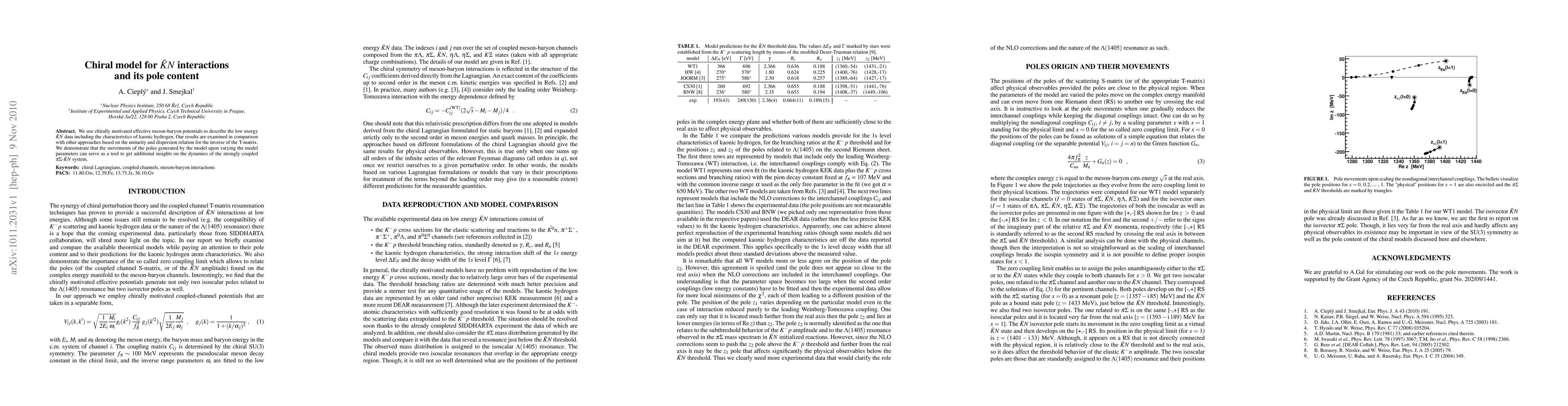 We use chirally motivated effective meson-baryon potentials to describe the low energy $\bar{K}N$ data including the characteristics of kaonic hydrogen. Our results are examined in comparison with other approaches based on the unitarity and dispersion relation for the inverse of the T-matrix. We demonstrate that the movements of the poles generated by the model upon varying the model parameters can serve as a tool to get additional insights on the dynamics of the strongly coupled $\pi\Sigma$-$\bar{K}N$ system.