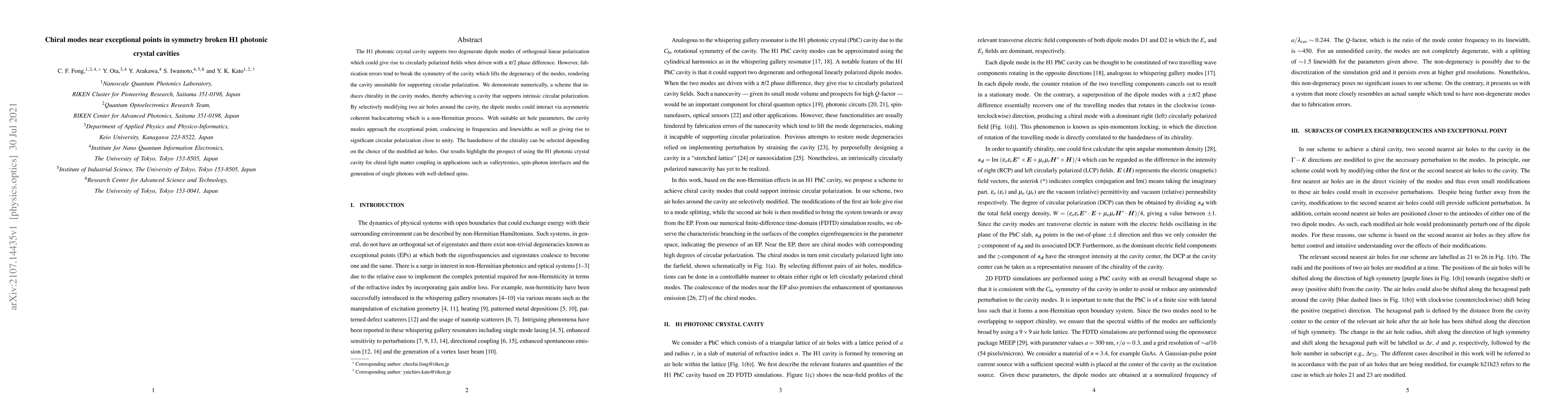 This paper demonstrates a method to induce chirality in H1 photonic crystal cavities by breaking symmetry through selective modification of air holes, enabling intrinsic circular polarization and potential applications in chiral-light matter coupling. The approach leverages asymmetric coherent backscattering to achieve modes near exceptional points, resulting in significant circular polarization.