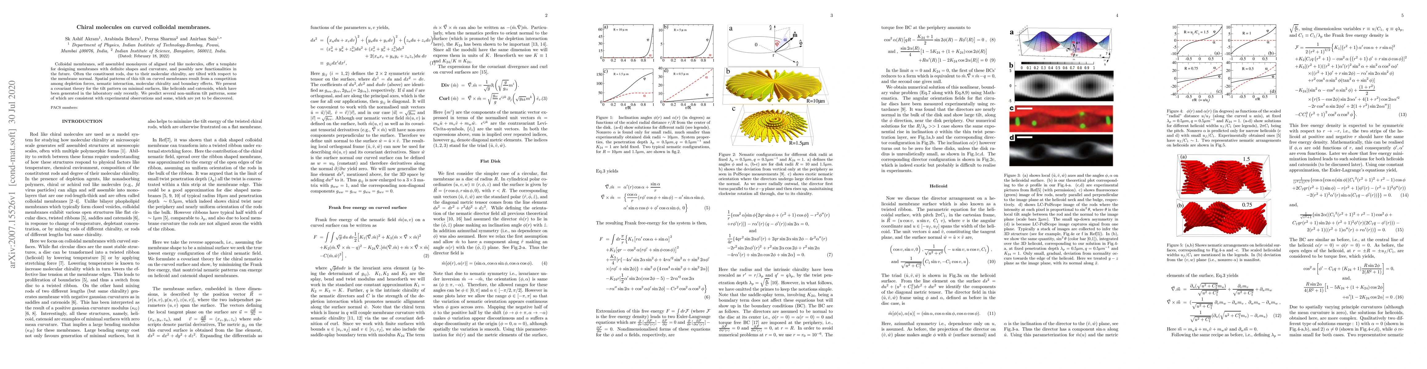 This paper develops a theoretical framework to predict the spatial patterns of chiral molecules' tilt on curved colloidal membranes, revealing the interplay between molecular chirality, nematic interactions, and boundary effects. The study focuses on minimal surfaces and predicts novel non-uniform tilt patterns, some of which align with recent experimental findings.
