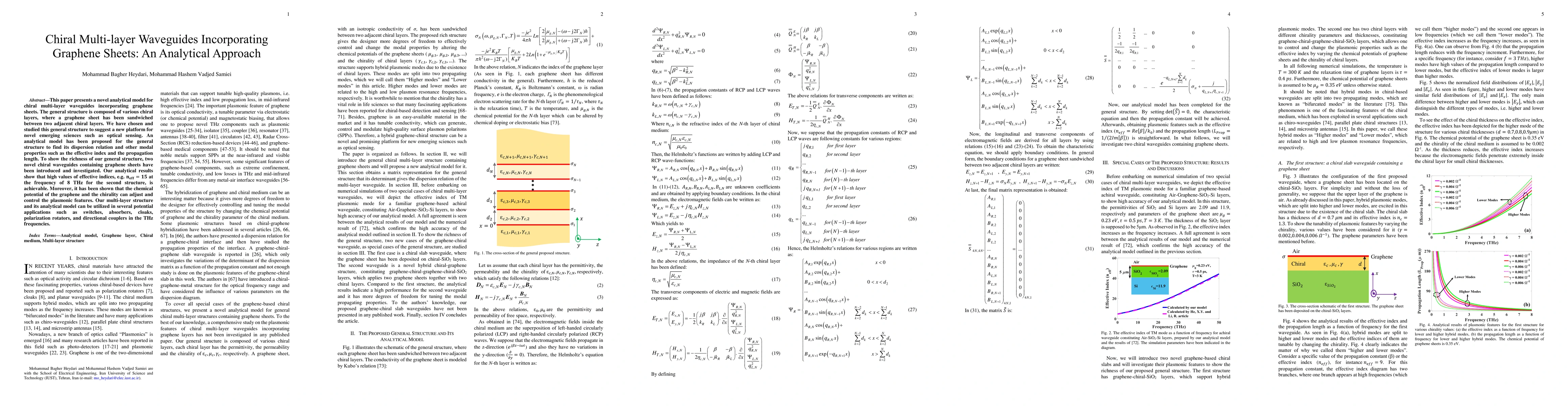 This paper introduces an analytical model for chiral multi-layer waveguides with graphene sheets, demonstrating high effective indices and tunable plasmonic features. The proposed structure shows potential for applications like optical sensing, switches, and polarization rotators in THz frequencies.
