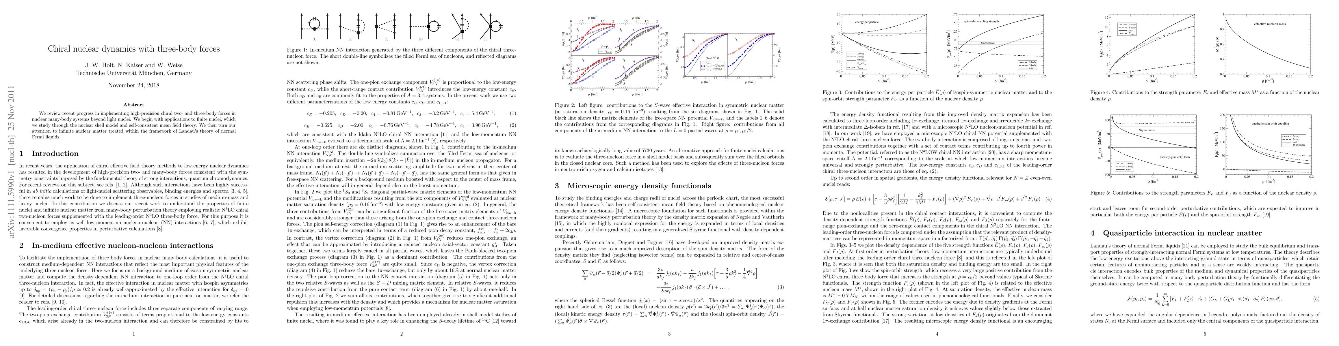 We review recent progress in implementing high-precision chiral two- and three-body forces in nuclear many-body systems beyond light nuclei. We begin with applications to finite nuclei, which we study through the nuclear shell model and self-consistent mean field theory. We then turn our attention to infinite nuclear matter treated within the framework of Landau's theory of normal Fermi liquids.