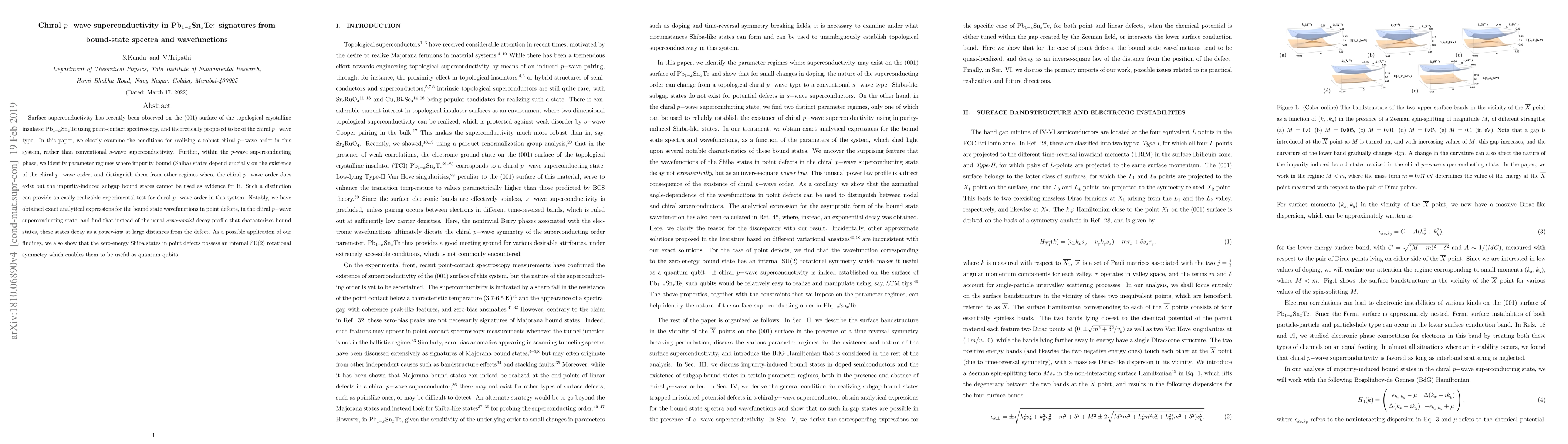 Surface superconductivity has recently been observed on the (001) surface of the topological crystalline insulator Pb$_{1-x}$Sn$_{x}$Te using point-contact spectroscopy, and theoretically proposed to be of the chiral $p-$wave type. In this paper, we closely examine the conditions for realizing a robust chiral $p-$wave order in this system, rather than conventional $s$-wave superconductivity. Further, within the $p$-wave superconducting phase, we identify parameter regimes where impurity bound (Shiba) states depend crucially on the existence of the chiral $p-$wave order, and distinguish them from other regimes where the chiral $p-$wave order does exist but the impurity-induced subgap bound states cannot be used as evidence for it. Such a distinction can provide an easily realizable experimental test for chiral $p-$wave order in this system. Notably, we have obtained exact analytical expressions for the bound state wavefunctions in point defects, in the chiral $p-$wave superconducting state, and find that instead of the usual $exponential$ decay profile that characterizes bound states, these states decay as a $power-law$ at large distances from the defect. As a possible application of our findings, we also show that the zero-energy Shiba states in point defects possess an internal SU(2) rotational symmetry which enables them to be useful as quantum qubits.