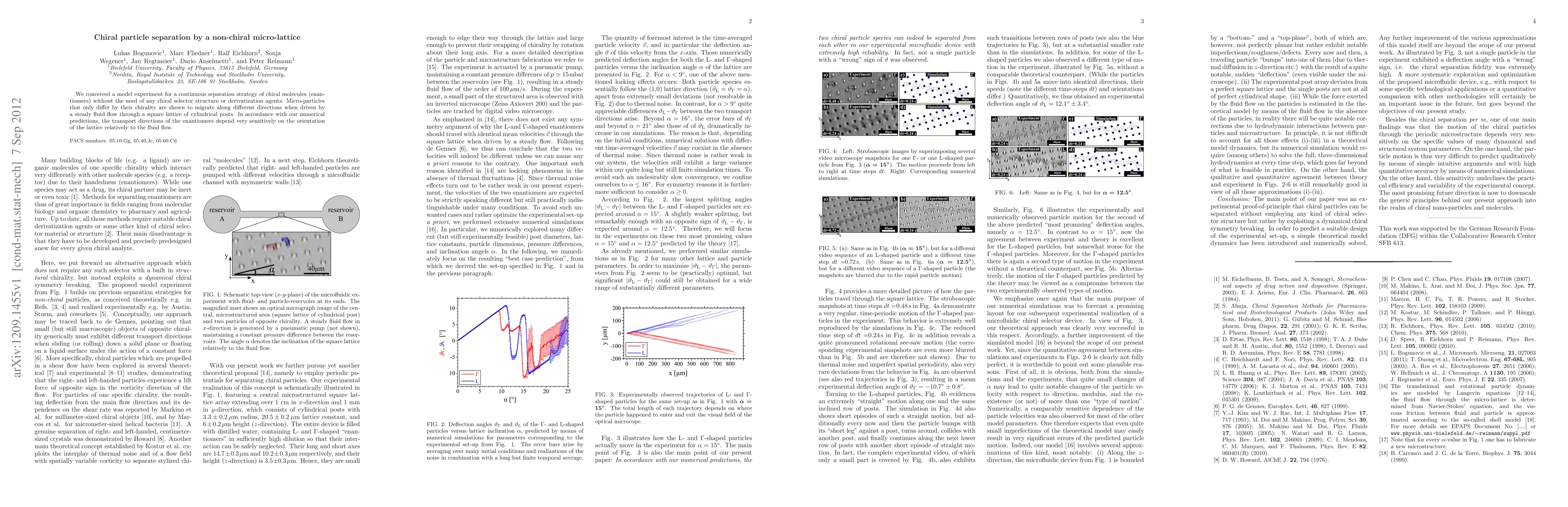 We conceived a model experiment for a continuous separation strategy of chiral molecules (enantiomers) without the need of any chiral selector structure or derivatization agents: Micro-particles that only differ by their chirality are shown to migrate along different directions when driven by a steady fluid flow through a square lattice of cylindrical posts. In accordance with our numerical predictions, the transport directions of the enantiomers depend very sensitively on the orientation of the lattice relatively to the fluid flow.