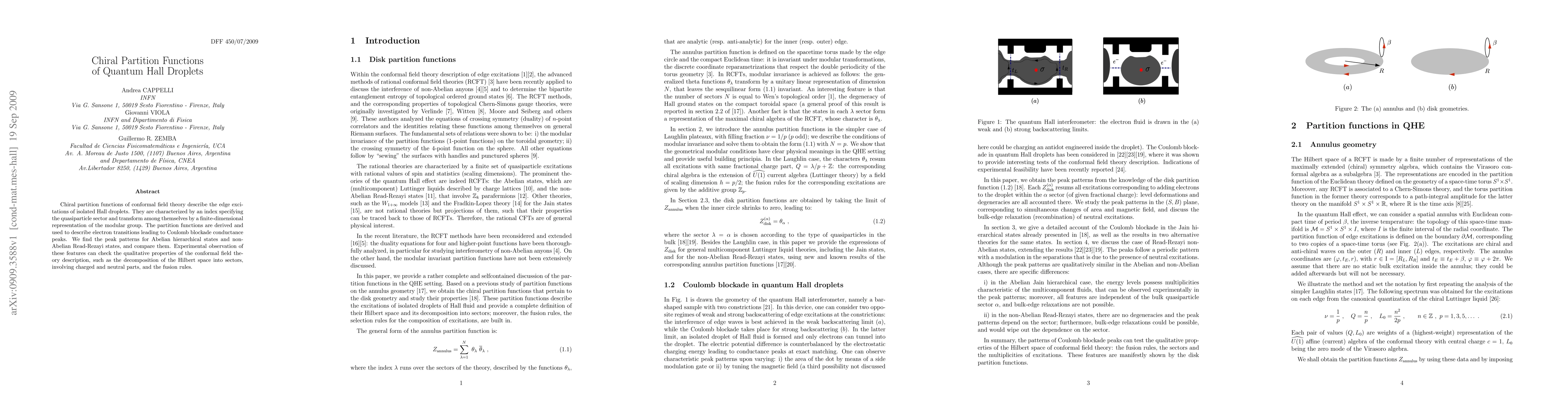 Chiral partition functions of conformal field theory describe the edge excitations of isolated Hall droplets. They are characterized by an index specifying the quasiparticle sector and transform among themselves by a finite-dimensional representation of the modular group. The partition functions are derived and used to describe electron transitions leading to Coulomb blockade conductance peaks. We find the peak patterns for Abelian hierarchical states and non-Abelian Read-Rezayi states, and compare them. Experimental observation of these features can check the qualitative properties of the conformal field theory description, such as the decomposition of the Hilbert space into sectors, involving charged and neutral parts, and the fusion rules.