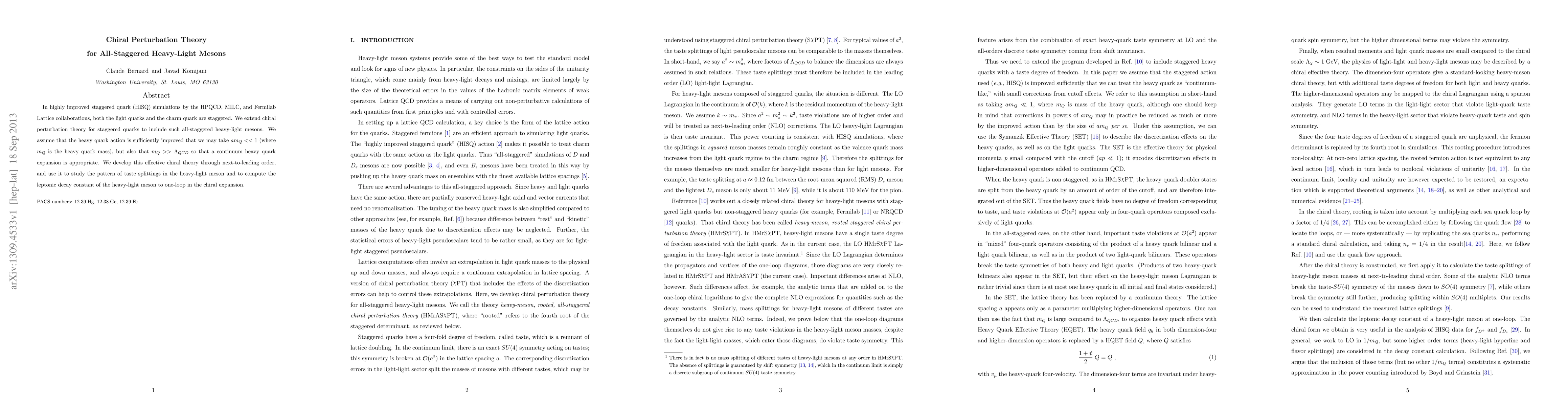 In highly improved staggered quark (HISQ) simulations by the HPQCD, MILC, and Fermilab Lattice collaborations, both the light quarks and the charm quark are staggered. We extend chiral perturbation theory for staggered quarks to include such all-staggered heavy-light mesons. We assume that the heavy quark action is sufficiently improved that we may take $a m_Q <<1$ (where $m_Q$ is the heavy quark mass), but also that $m_Q>>\Lambda_{QCD}$ so that a continuum heavy quark expansion is appropriate. We develop this effective chiral theory through next-to-leading order, and use it to study the pattern of taste splittings in the heavy-light meson and to compute the leptonic decay constant of the heavy-light meson to one-loop in the chiral expansion.