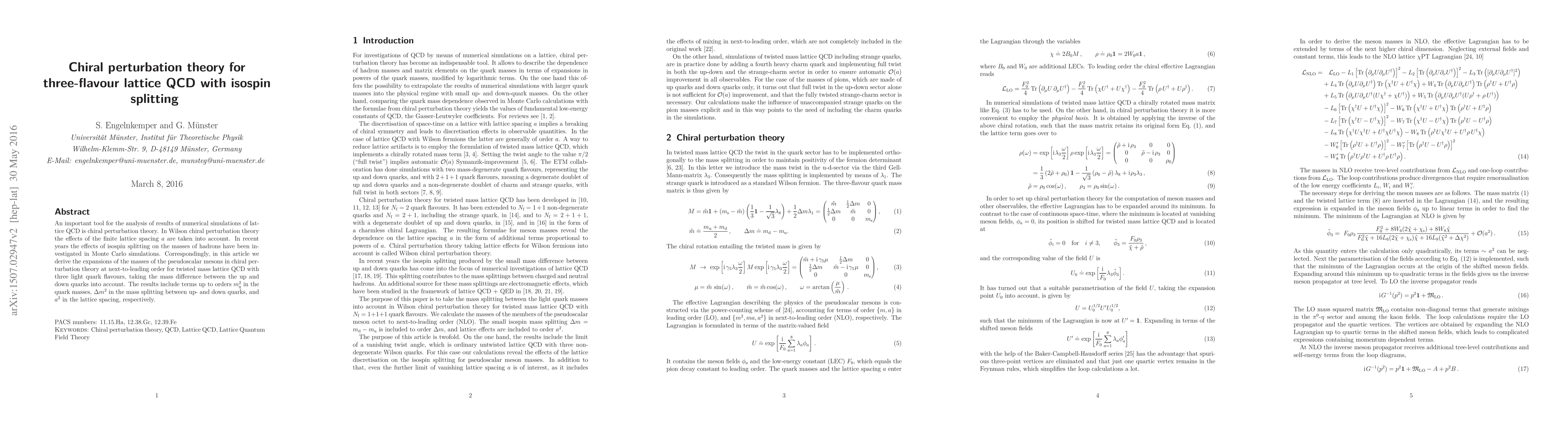 This paper derives next-to-leading order expansions for pseudoscalar meson masses in chiral perturbation theory for three-flavour lattice QCD, incorporating isospin splitting effects, finite lattice spacing, and terms up to $m_q^2$, $\Delta m^2$, and $a^2$.