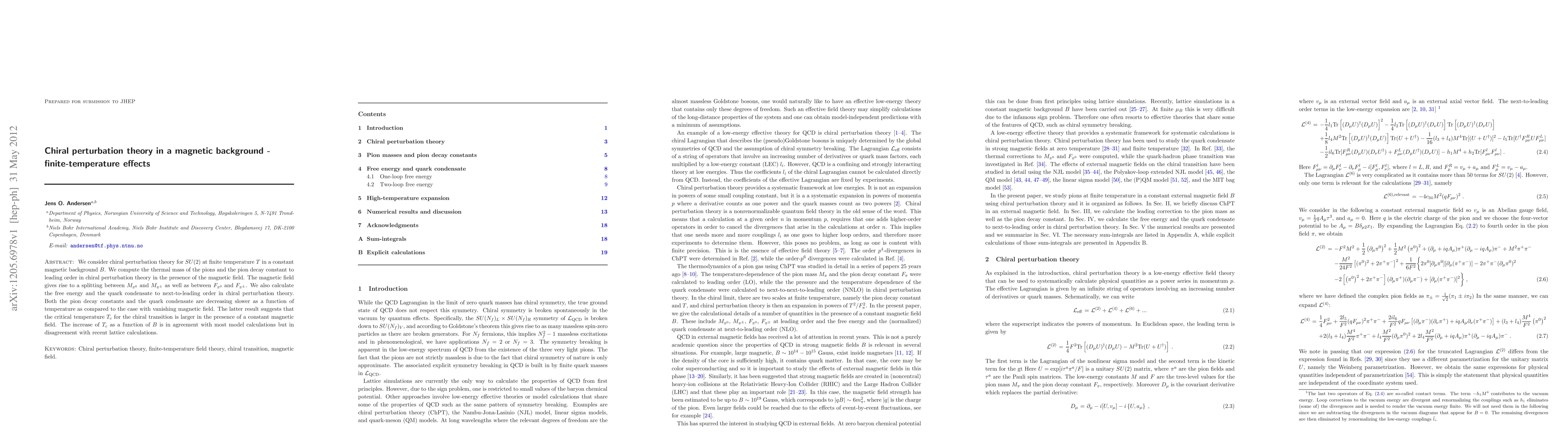 We consider chiral perturbation theory for SU(2) at finite temperature $T$ in a constant magnetic background $B$. We compute the thermal mass of the pions and the pion decay constant to leading order in chiral perturbation theory in the presence of the magnetic field. The magnetic field gives rise to a splitting between $M_{\pi^0}$ and $M_{\pi^{\pm}}$ as well as between $F_{\pi^0}$ and $F_{\pi^{\pm}}$. We also calculate the free energy and the quark condensate to next-to-leading order in chiral perturbation theory. Both the pion decay constants and the quark condensate are decreasing slower as a function of temperature as compared to the case with vanishing magnetic field. The latter result suggests that the critical temperature $T_c$ for the chiral transition is larger in the presence of a constant magnetic field. The increase of $T_c$ as a function of $B$ is in agreement with most model calculations but in disagreement with recent lattice calculations.