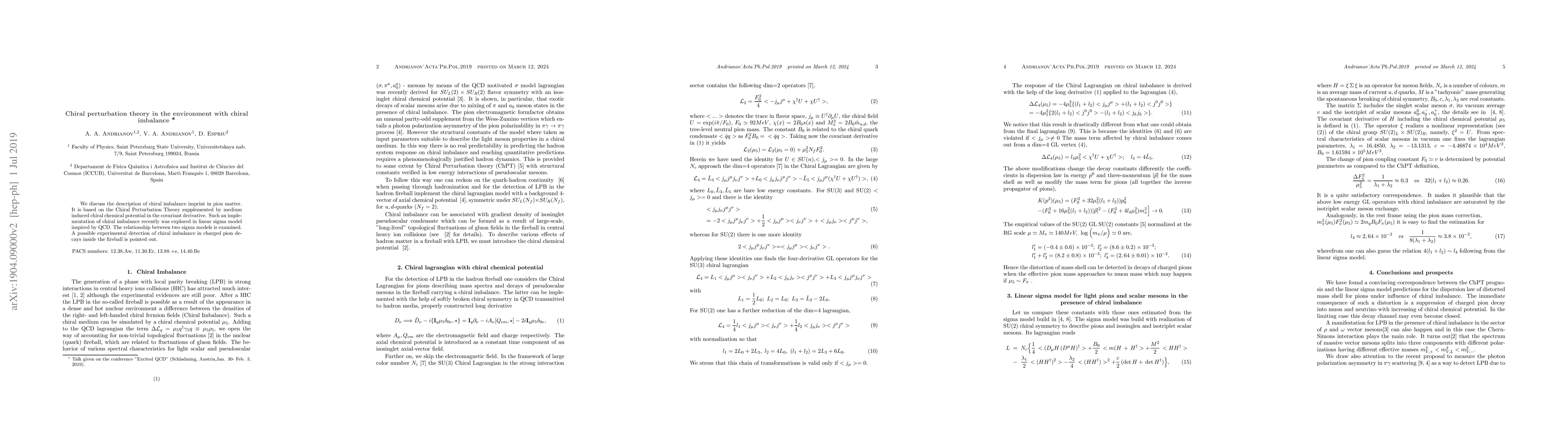 We discuss the description of chiral imbalance imprint in pion matter. It is based on the Chiral Perturbation Theory supplemented by medium induced chiral chemical potential in the covariant derivative. Such an implementation of chiral imbalance recently was explored in linear sigma model inspired by QCD. The relationship between two sigma models is examined. A possible experimental detection of chiral imbalance in charged pion decays inside the fireball is pointed out.