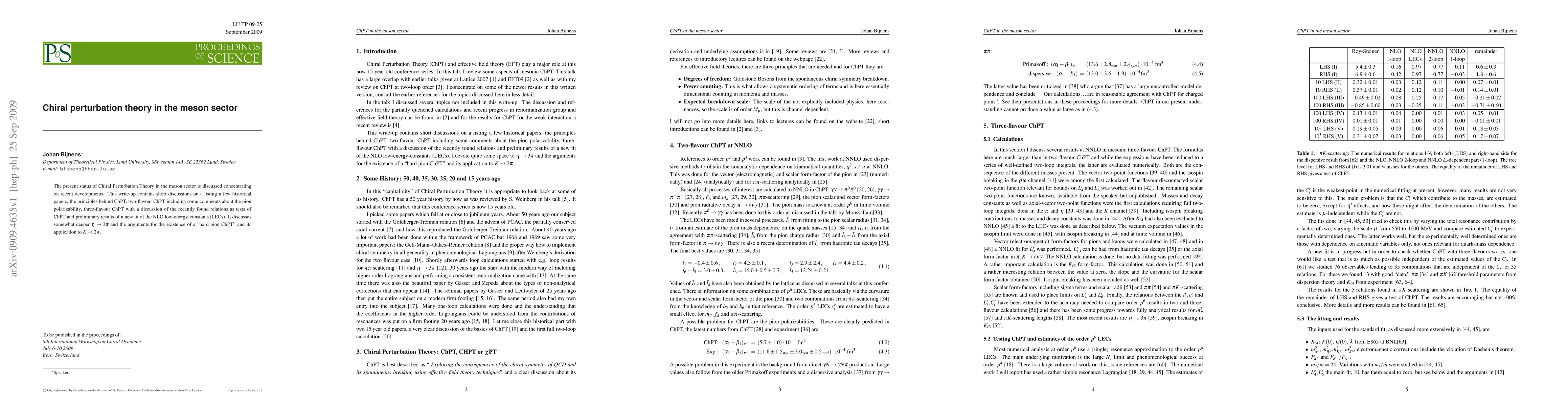 The present status of Chiral Perturbation Theory in the meson sector is discussed concentrating on recent developments. This write-up contains short discussions on a listing a few historical papers, the principles behind ChPT, two-flavour ChPT including some comments about the pion polarizability, three-flavour ChPT with a discussion of the recently found relations as tests of ChPT and preliminary results of a new fit of the NLO low-energy-constants (LECs). It discusses somewhat deeper $\eta\to3\pi$ and the arguments for the existence of a ``hard pion ChPT'' and its application to $K\to2\pi$.