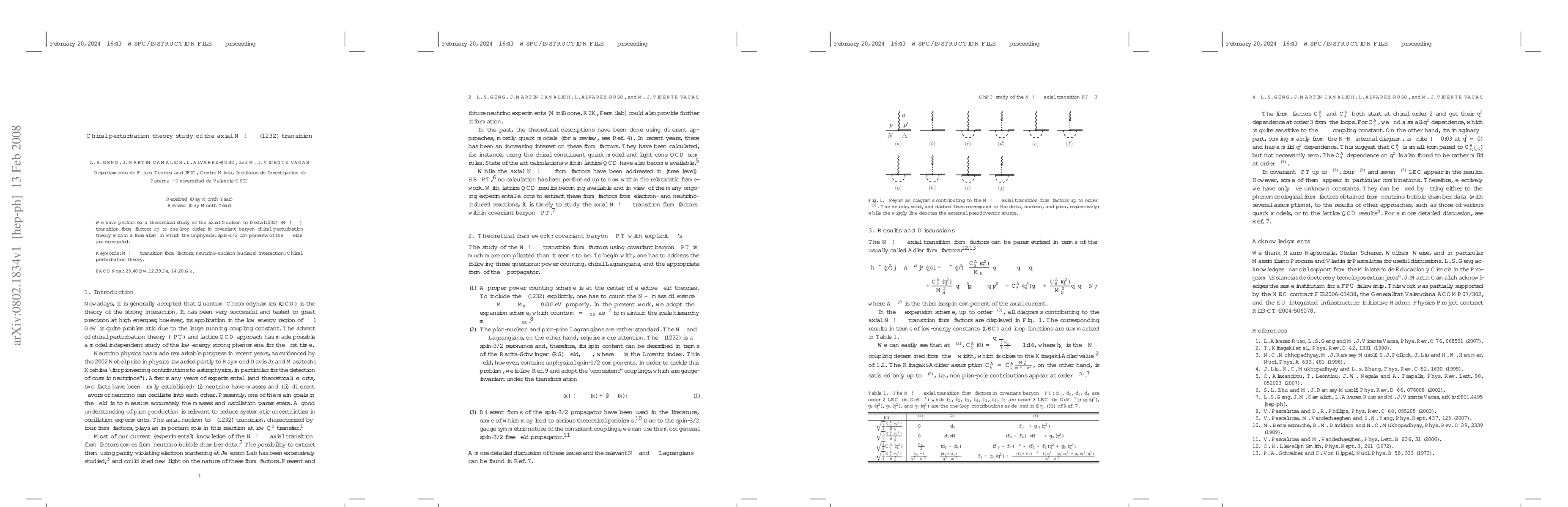 This paper investigates the axial transition from nucleons to Delta(1232) resonances using one-loop covariant baryon chiral perturbation theory, decoupling unphysical spin-1/2 components of the Delta fields to provide accurate form factors.