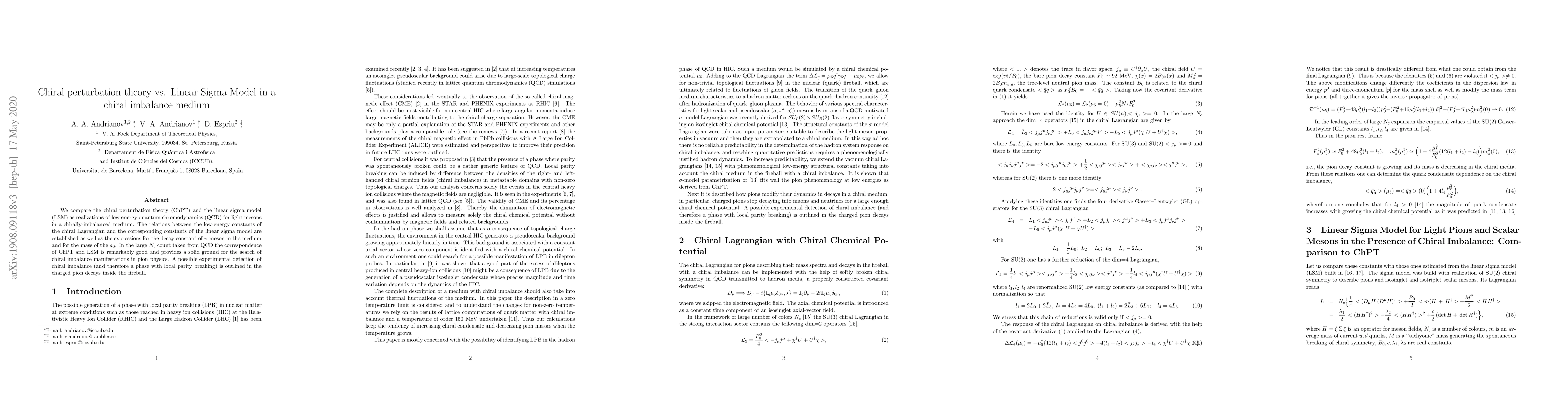 We compare Chiral Perturbation Theory (ChPT) and the Linear Sigma Model (LSM) as realizations of low energy QCD for light mesons in a chirally imbalanced medium. The relations between the low-energy constants of the Chiral Lagrangian and the corresponding constants of the Linear Sigma Model are established as well as the expressions for the decay constant of the $\pi$-meson in the medium and the mass of the $a_0$. In the large $N_c$ count taken from QCD the correspondence of ChPT and LSM is remarkably good and give a solid ground for search of chiral imbalance manifestation in pion physics. A possible experimental detection of chiral imbalance tracks (and therefore a phase with Local Parity Breaking) in the charged pion decays inside the fireball is outlined.