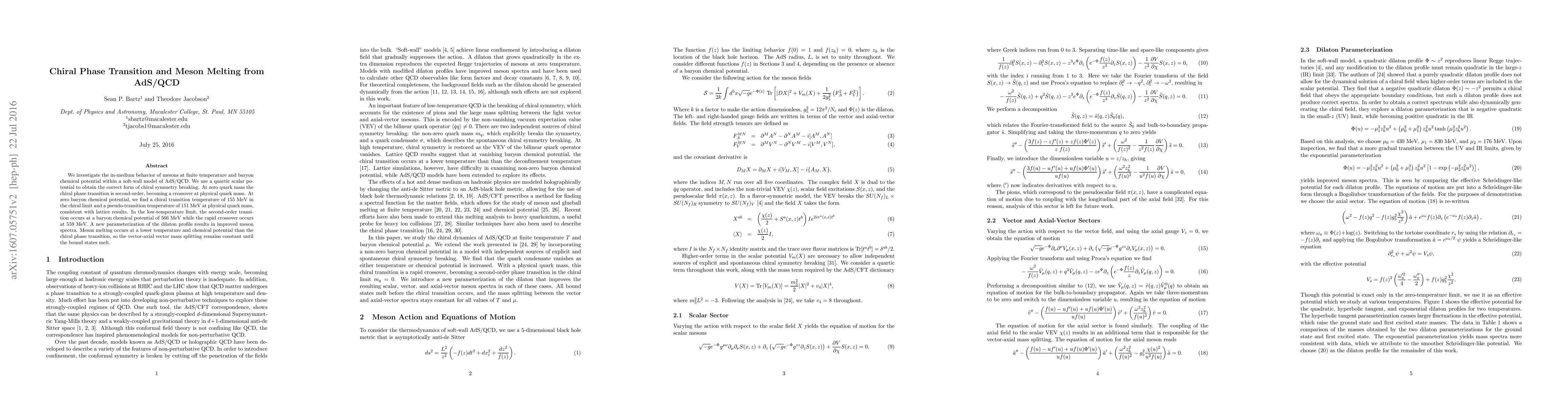 This research examines meson behavior in high-temperature and high-density environments using AdS/QCD and a soft-wall model. It reveals a second-order chiral phase transition at low quark mass, turning into a crossover at physical quark mass, with meson melting occurring below the transition temperature.