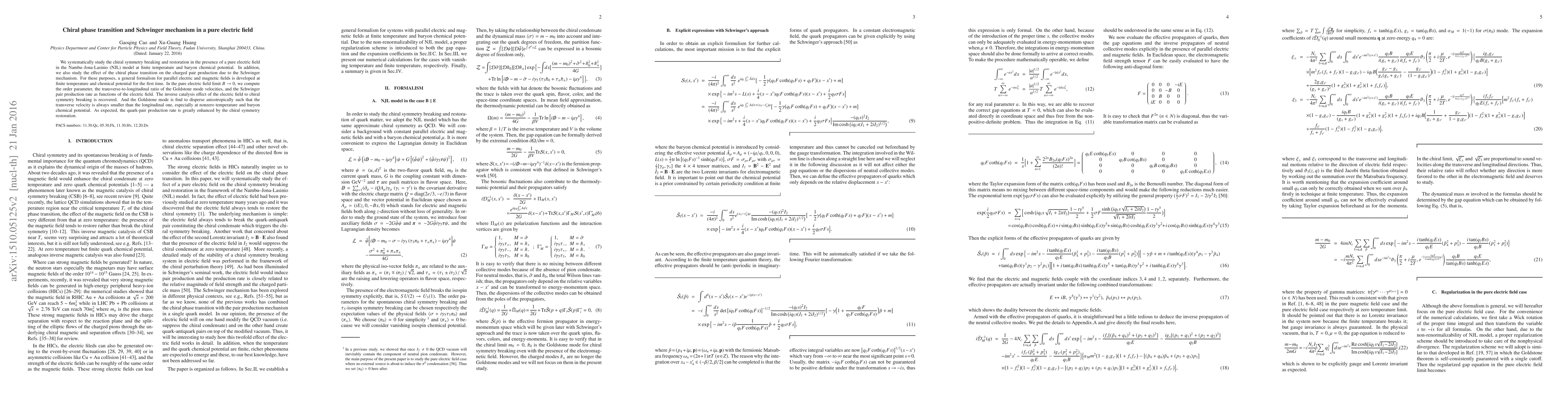 This paper investigates chiral symmetry breaking and restoration in the Nambu-Jona-Lasinio model under a pure electric field at finite temperature and baryon chemical potential, developing a new formalism for electric and magnetic fields. It finds that the chiral phase transition enhances charged pair production via the Schwinger mechanism, with the electric field catalyzing chiral symmetry restoration and anisotropically dispersing Goldstone modes.