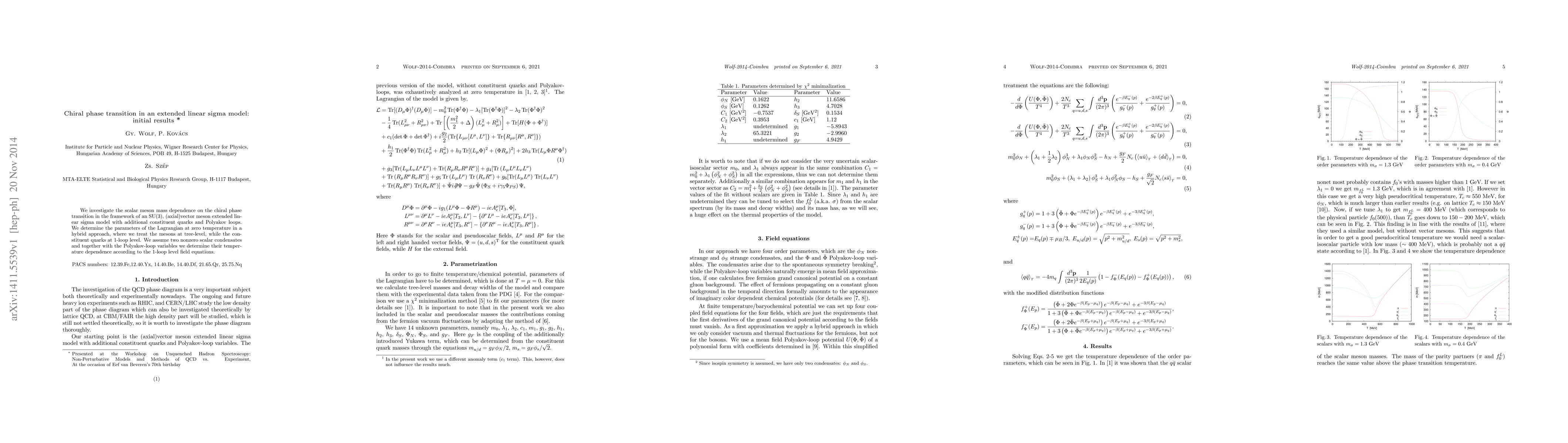 We investigate the scalar meson mass dependence on the chiral phase transition in the framework of an SU(3), (axial)vector meson extended linear sigma model with additional constituent quarks and Polyakov loops. We determine the parameters of the Lagrangian at zero temperature in a hybrid approach, where we treat the mesons at tree-level, while the constituent quarks at 1-loop level. We assume two nonzero scalar condensates and together with the Polyakov-loop variables we determine their temperature dependence according to the 1-loop level field equations.
