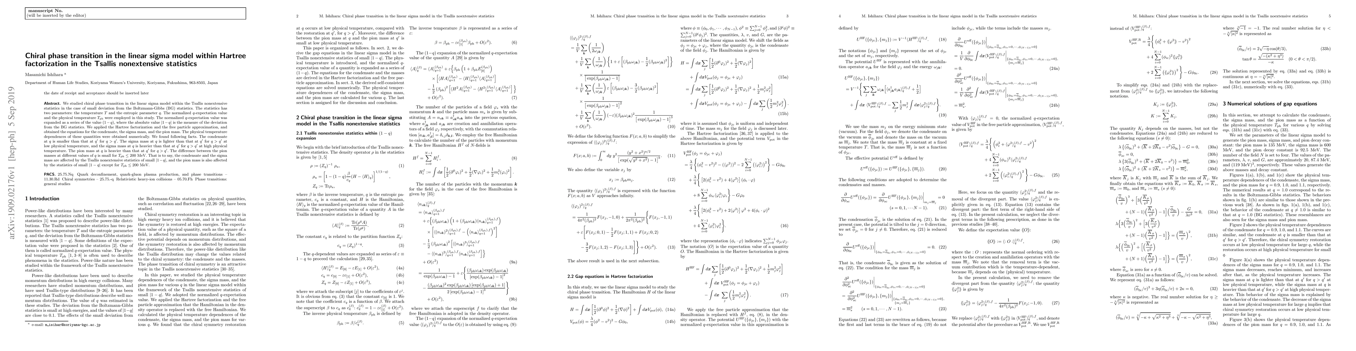We studied chiral phase transition in the linear sigma model within the Tsallis nonextensive statistics in the case of small deviation from the Boltzmann-Gibbs (BG) statistics. The statistics has two parameters: the temperature $T$ and the entropic parameter $q$. The normalized $q$-expectation value and the physical temperature $\Tph$ were employed in this study. The normalized $q$-expectation value was expanded as a series of the value $(1-q)$, where the absolute value $|1-q|$ is the measure of the deviation from the BG statistics. We applied the Hartree factorization and the free particle approximation, and obtained the equations for the condensate, the sigma mass, and the pion mass. The physical temperature dependences of these quantities were obtained numerically. We found following facts. The condensate at $q$ is smaller than that at $q'$ for $q>q'$. The sigma mass at $q$ is lighter than that at $q'$ for $q>q'$ at low physical temperature, and the sigma mass at $q$ is heavier than that at $q'$ for $q>q'$ at high physical temperature. The pion mass at $q$ is heavier than that at $q'$ for $q>q'$. The difference between the pion masses at different values of $q$ is small for $\Tph \le 200$ MeV. That is to say, the condensate and the sigma mass are affected by the Tsallis nonextensive statistics of small $|1-q|$, and the pion mass is also affected by the statistics of small $|1-q|$ except for $\Tph \le 200$ MeV.