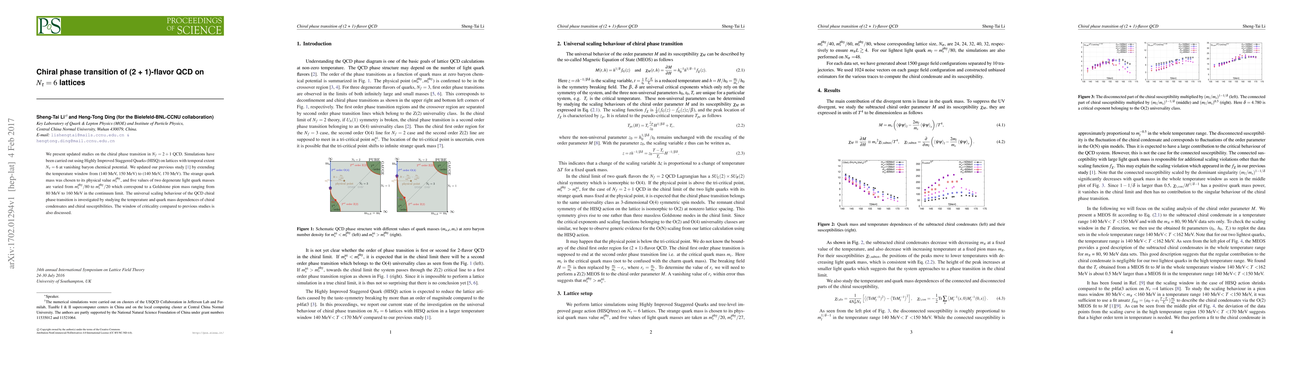 We present updated studies on the chiral phase transition in $N_{f}=2+1$ QCD. Simulations have been carried out using Highly Improved Staggered Quarks (HISQ) on lattices with temporal extent $N_{\tau} = 6$ at vanishing baryon chemical potential. We updated our previous study \cite{Ding:2015pmg} by extending the temperature window from (140 MeV, 150 MeV) to (140 MeV, 170 MeV). The strange quark mass was chosen to its physical value $m_{s}^{\mathrm{phy}}$, and five values of two degenerate light quark masses are varied from $m_{s}^{\mathrm{phy}}/80$ to $m_{s}^{\mathrm{phy}}/20$ which correspond to a Goldstone pion mass ranging from 80 MeV to 160 MeV in the continuum limit. The universal scaling behaviour of the QCD chiral phase transition is investigated by studying the temperature and quark mass dependences of chiral condensates and chiral susceptibilities. The window of criticality compared to previous studies is also discussed.