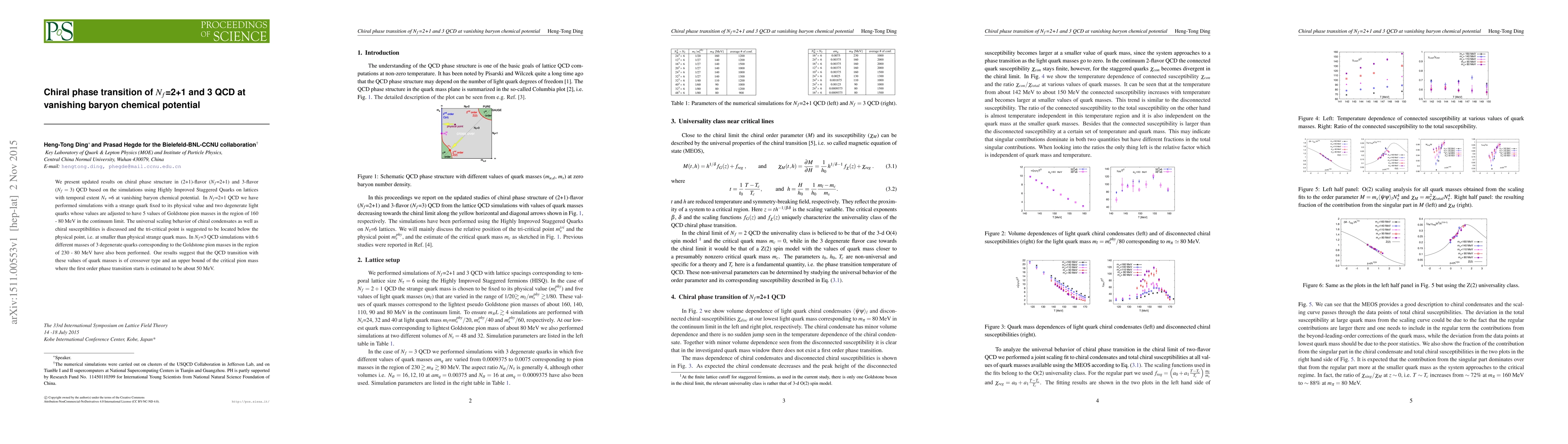 We present updated results on chiral phase structure in (2+1)-flavor ($N_f$=2+1) and 3-flavor ($N_f=3$) QCD based on the simulations using Highly Improved Staggered Quarks on lattices with temporal extent $N_\tau$ =6 at vanishing baryon chemical potential. In $N_f$=2+1 QCD we have performed simulations with a strange quark fixed to its physical value and two degenerate light quarks whose values are adjusted to have 5 values of Goldstone pion masses in the region of 160 - 80 MeV in the continuum limit. The universal scaling behavior of chiral condensates as well as chiral susceptibilities is discussed and the tri-critical point is suggested to be located below the physical point, i.e. at smaller than physical strange quark mass. In $N_f$=3 QCD simulations with 6 different masses of 3 degenerate quarks corresponding to the Goldstone pion masses in the region of 230 - 80 MeV have also been performed. Our results suggest that the QCD transition with these values of quark masses is of crossover type and an upper bound of the critical pion mass where the first order phase transition starts is estimated to be about 50 MeV.