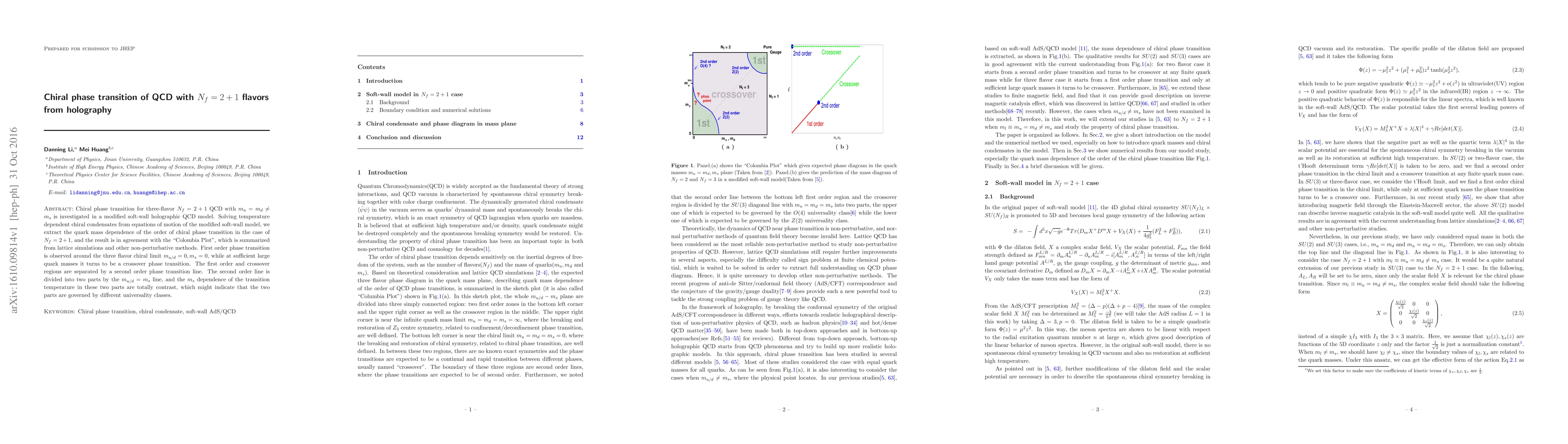 This paper investigates the chiral phase transition in three-flavor QCD using a modified holographic QCD model, finding that it transitions from first order near the chiral limit to a crossover at larger quark masses. The results align with the "Colombia Plot," indicating different universality classes for the two regions separated by a second-order phase transition line.