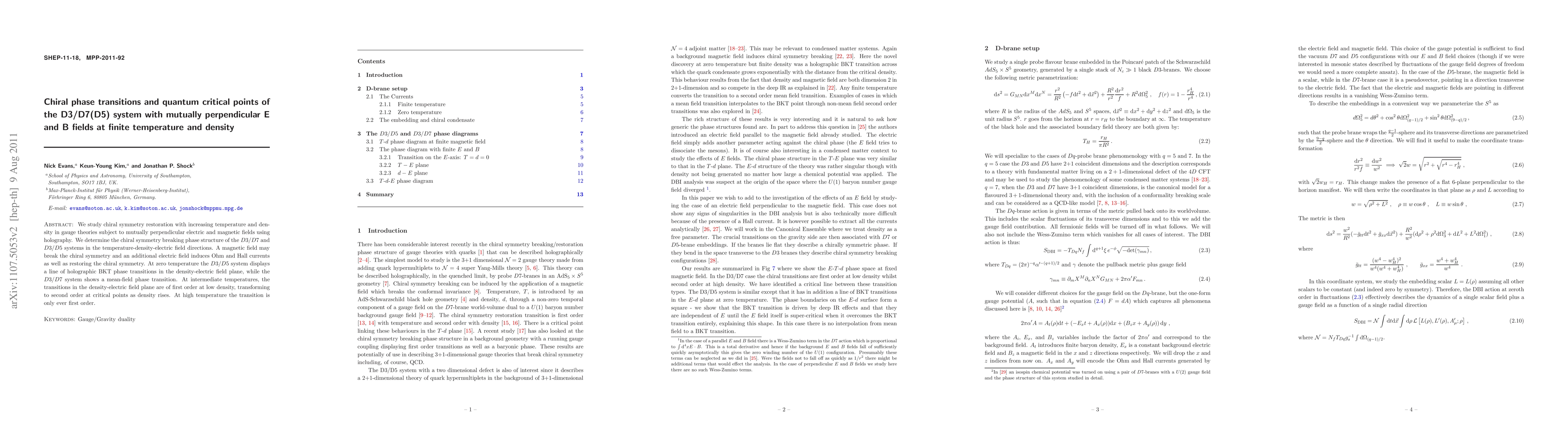 This paper investigates chiral symmetry restoration in gauge theories under perpendicular electric and magnetic fields using holography, revealing phase transitions in D3/D7 and D3/D5 systems at finite temperature and density. The D3/D5 system exhibits holographic BKT phase transitions at zero temperature, while the D3/D7 system shows mean-field transitions, with transitions evolving from first to second order as density increases.