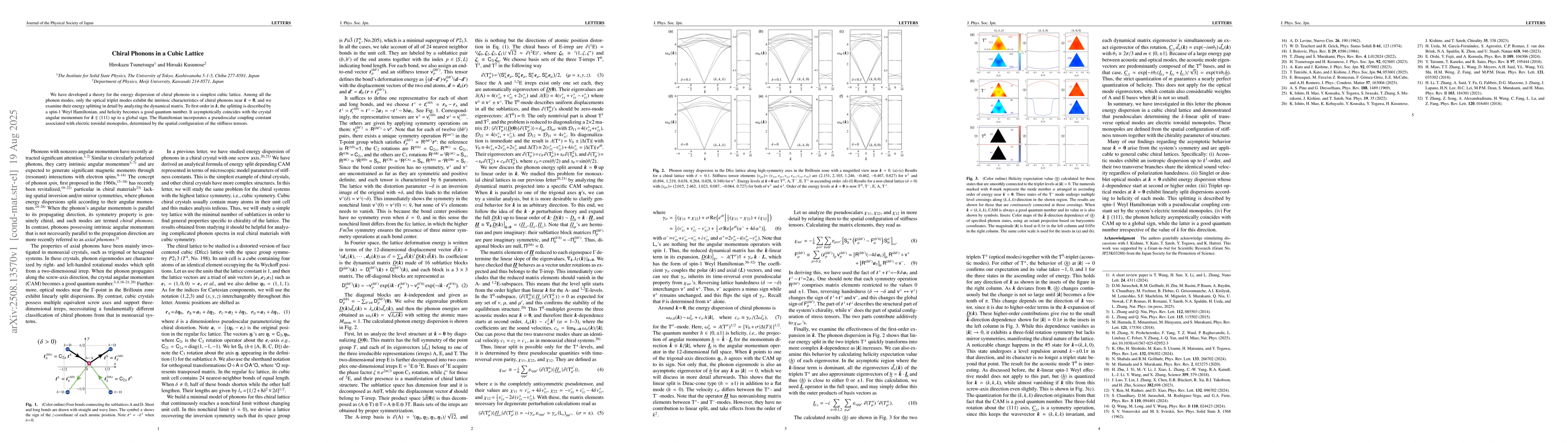 We have developed a theory for the energy dispersion of chiral phonons in a simplest cubic lattice. Among all the phonon modes, only the optical triplet modes exhibit the intrinsic characteristics of chiral phonons near k=0, and we examine their energy splitting in detail by analyzing the dynamical matrix. To first order in k, the splitting is described by a spin-1 Weyl Hamiltonian, and helicity becomes a good quantum number. It asymptotically coincides with the crystal angular momentum for k parallel <111> up to a global sign. The Hamiltonian incorporates a pseudoscalar coupling constant associated with electric toroidal monopoles, determined by the spatial configuration of the stiffness tensors.