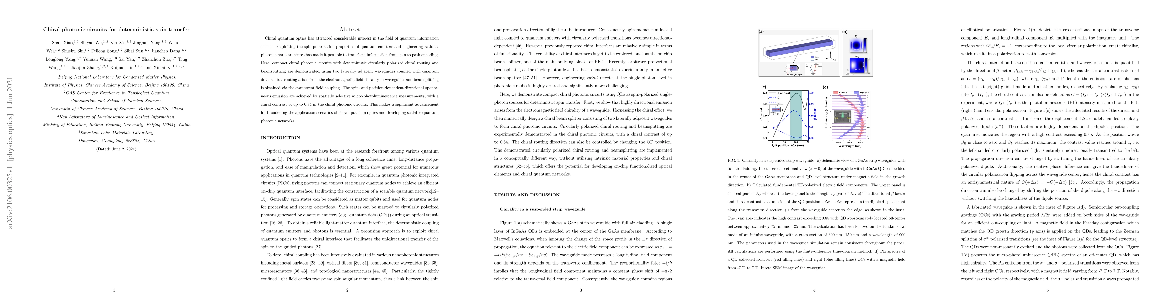 Chiral quantum optics has attracted considerable interest in the field of quantum information science. Exploiting the spin-polarization properties of quantum emitters and engineering rational photonic nanostructures has made it possible to transform information from spin to path encoding. Here, compact chiral photonic circuits with deterministic circularly polarized chiral routing and beamsplitting are demonstrated using two laterally adjacent waveguides coupled with quantum dots. Chiral routing arises from the electromagnetic field chirality in waveguide, and beamsplitting is obtained via the evanescent field coupling. The spin- and position-dependent directional spontaneous emission are achieved by spatially selective micro-photoluminescence measurements, with a chiral contrast of up to 0.84 in the chiral photonic circuits. This makes a significant advancement for broadening the application scenarios of chiral quantum optics and developing scalable quantum photonic networks.