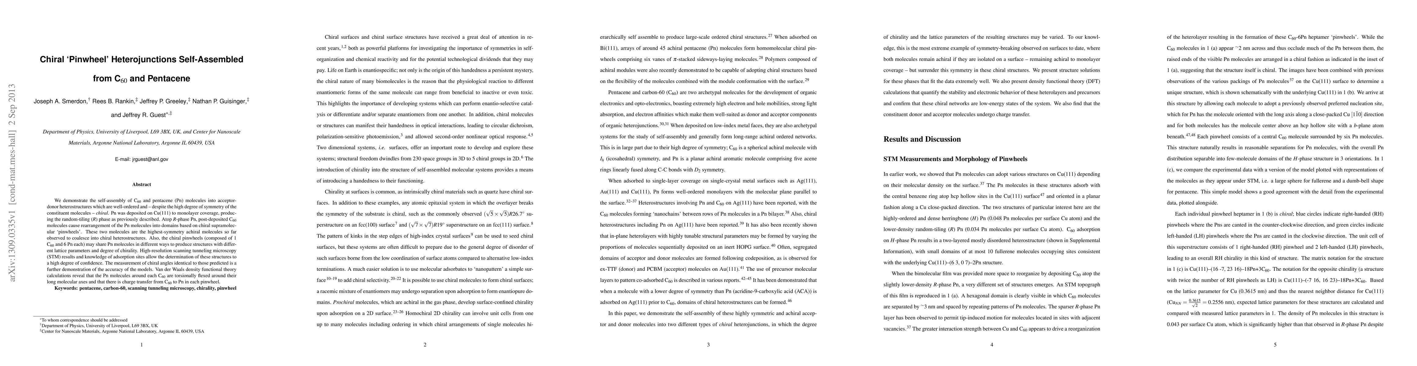 We demonstrate the self-assembly of C$_{60}$ and pentacene (Pn) molecules into acceptor-donor heterostructures which are well-ordered and -- despite the high degree of symmetry of the constituent molecules -- {\it chiral}. Pn was deposited on Cu(111) to monolayer coverage, producing the random-tiling ($R$) phase as previously described. Atop $R$-phase Pn, post-deposited C$_{60}$ molecules cause rearrangement of the Pn molecules into domains based on chiral supramolecular `pinwheels'. These two molecules are the highest-symmetry achiral molecules so far observed to coalesce into chiral heterostructures. Also, the chiral pinwheels (composed of 1 C$_{60}$ and 6 Pn each) may share Pn molecules in different ways to produce structures with different lattice parameters and degree of chirality. High-resolution scanning tunneling microscopy (STM) results and knowledge of adsorption sites allow the determination of these structures to a high degree of confidence. The measurement of chiral angles identical to those predicted is a further demonstration of the accuracy of the models. Van der Waals density functional theory calculations reveal that the Pn molecules around each C$_{60}$ are torsionally flexed around their long molecular axes and that there is charge transfer from C$_{60}$ to Pn in each pinwheel.
