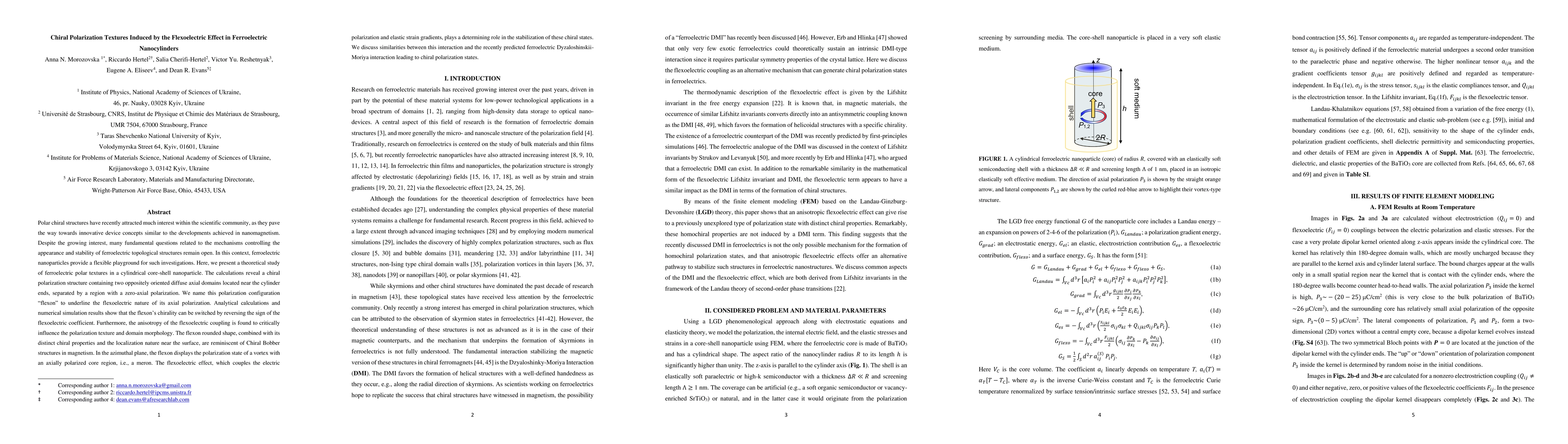 Polar chiral structures have recently attracted much interest within the scientific community, as they pave the way towards innovative device concepts similar to the developments achieved in nanomagnetism. Despite the growing interest, many fundamental questions related to the mechanisms controlling the appearance and stability of ferroelectric topological structures remain open. In this context, ferroelectric nanoparticles provide a flexible playground for such investigations. Here, we present a theoretical study of ferroelectric polar textures in a cylindrical core-shell nanoparticle. The calculations reveal a chiral polarization structure containing two oppositely oriented diffuse axial domains located near the cylinder ends, separated by a region with a zero-axial polarization. We name this polarization configuration "flexon" to underline the flexoelectric nature of its axial polarization. Analytical calculations and numerical simulation results show that the flexon's chirality can be switched by reversing the sign of the flexoelectric coefficient. Furthermore, the anisotropy of the flexoelectric coupling is found to critically influence the polarization texture and domain morphology. The flexon rounded shape, combined with its distinct chiral properties and the localization nature near the surface, are reminiscent of Chiral Bobber structures in magnetism. In the azimuthal plane, the flexon displays the polarization state of a vortex with an axially polarized core region, i.e., a meron. The flexoelectric effect, which couples the electric polarization and elastic strain gradients, plays a determining role in the stabilization of these chiral states. We discuss similarities between this interaction and the recently predicted ferroelectric Dyzaloshinskii-Moriya interaction leading to chiral polarization states.
